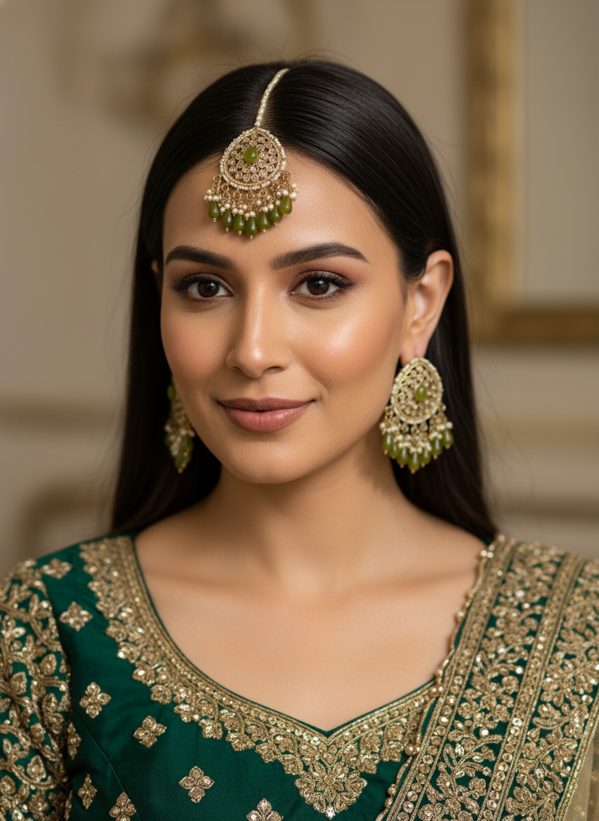 Designed with rich olive green stones and a classic gold-tone finish, this set beautifully complements traditional South Asian outfits such as lehengas, sarees, and anarkalis.