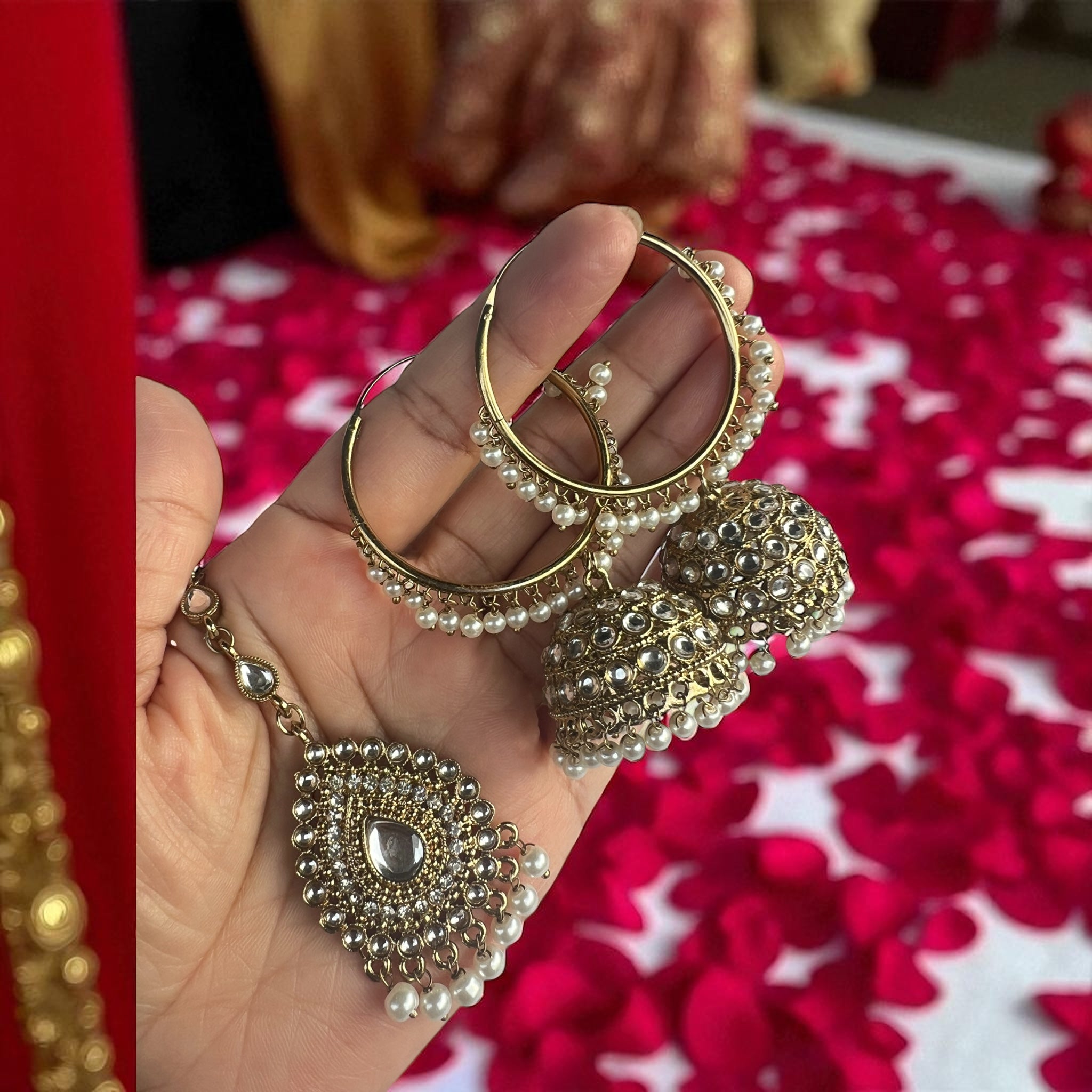 This stunning antique gold jewelry set exudes timeless elegance and is designed to enhance your traditional look. Crafted with intricate detail, the lightweight construction ensures comfort without compromising on style. The pair of hoop earrings and a matching tikka make the perfect accessory for weddings, festivals, or any special occasion.