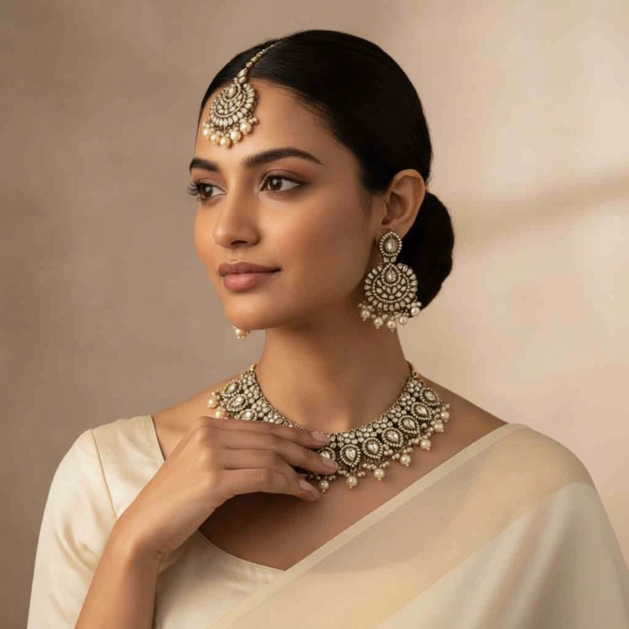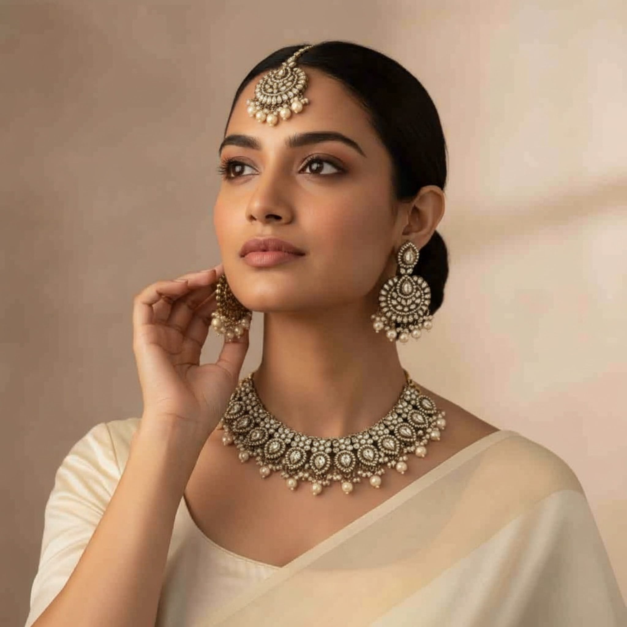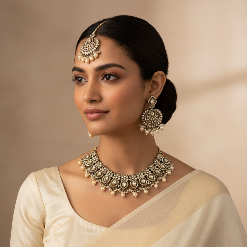 Gold Asian Indian Necklace Set – Elegant Indian bridal jewelry featuring a gold-plated necklace, matching tikka, and earrings. Perfect for weddings, receptions, and festive occasions. Traditional craftsmanship with a timeless ethnic look.