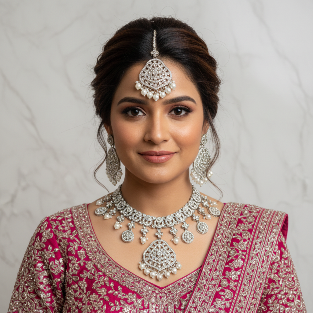 White and Silver Bridal Kundan Set – Elegant Indian wedding jewelry featuring a silver-plated necklace, matching tikka, and earrings with white stones. Perfect for brides, receptions, and special occasions. Traditional yet modern ethnic jewellery.