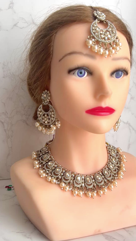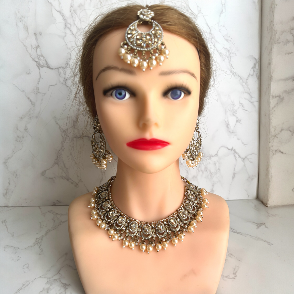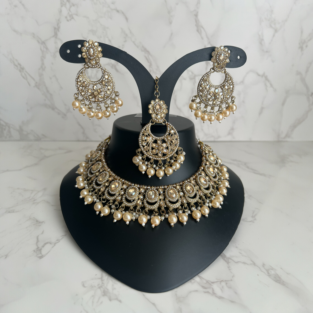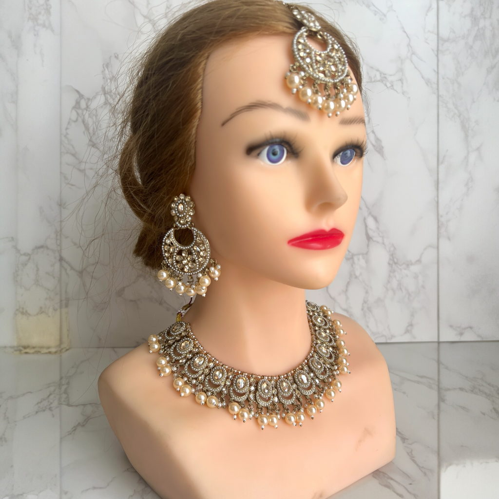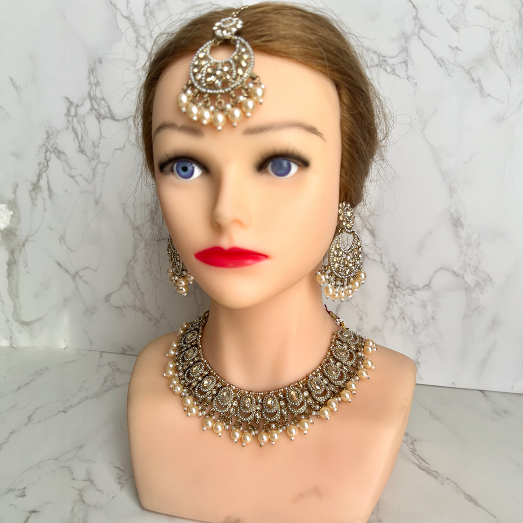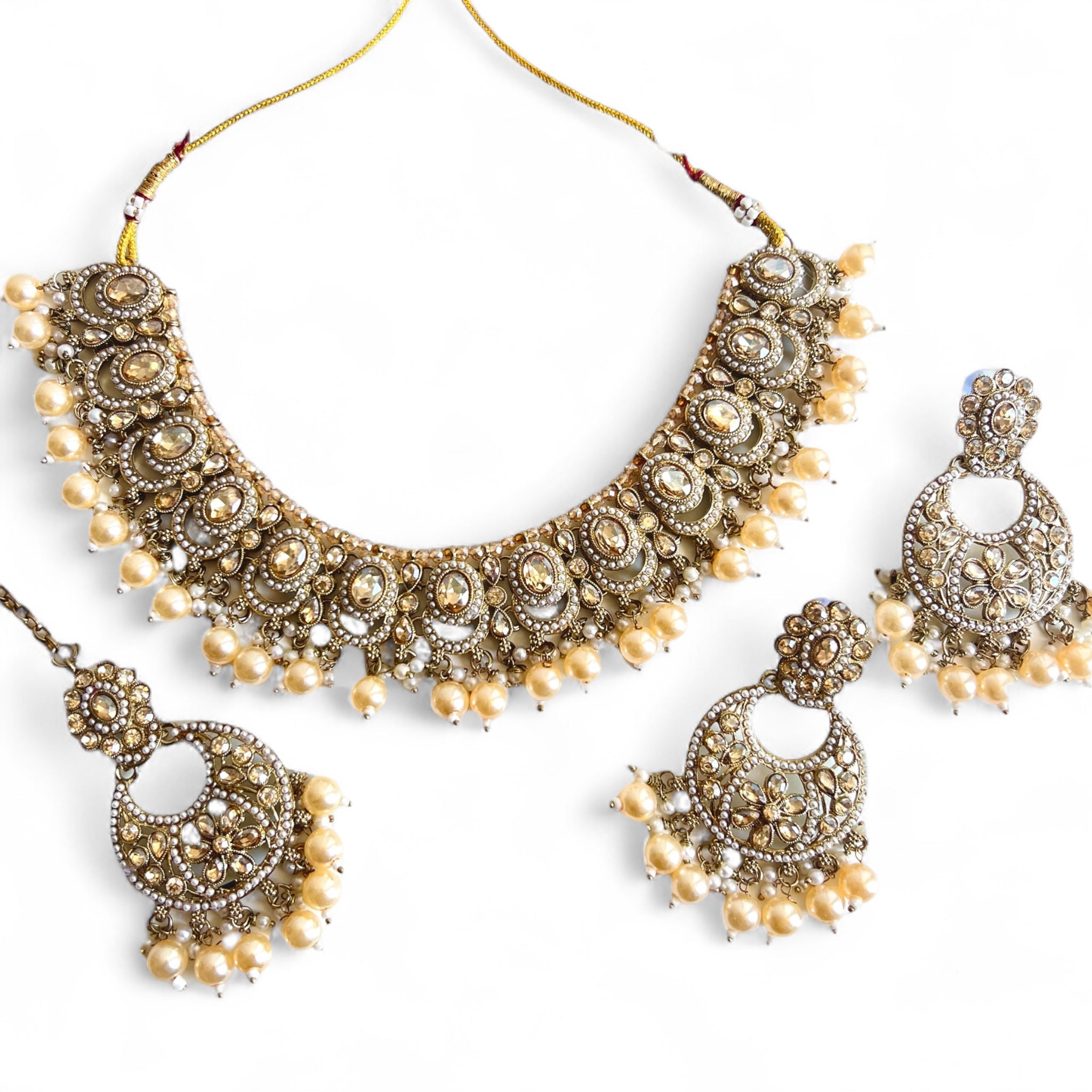 Kinza Gold Traditional Indian Necklace Tikka Earrings Set