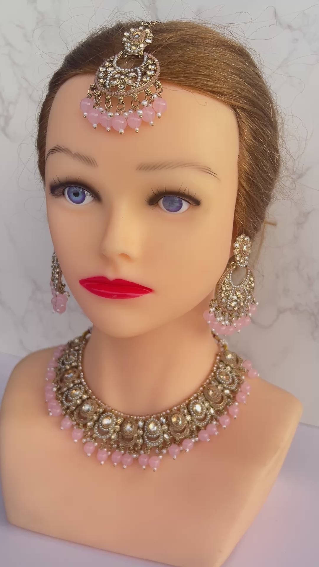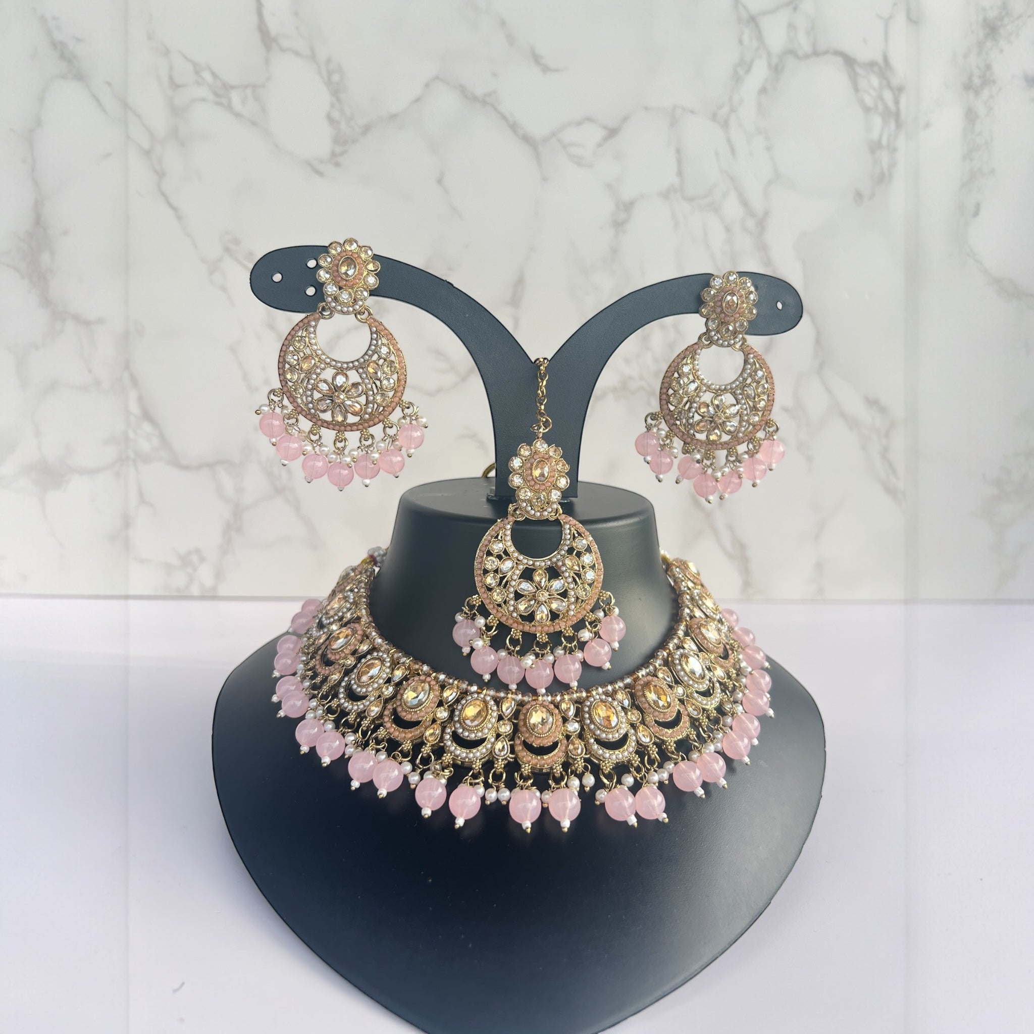 This delicate Asian Kundan necklace set in soft baby pink is paired with matching earrings and a tikka. Elegant and refined, it offers a graceful touch of colour while remaining affordable and versatile.