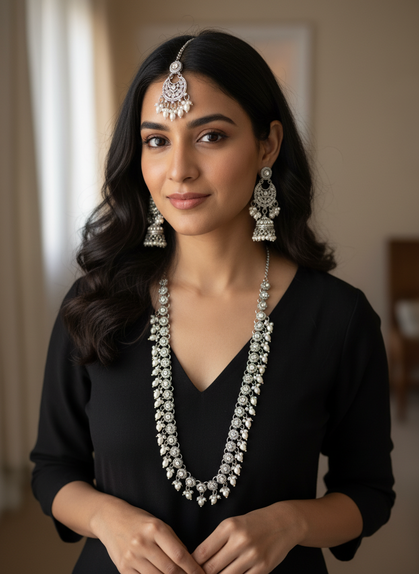 Aniya Long Silver Indian Necklace Tikk Earrings Set