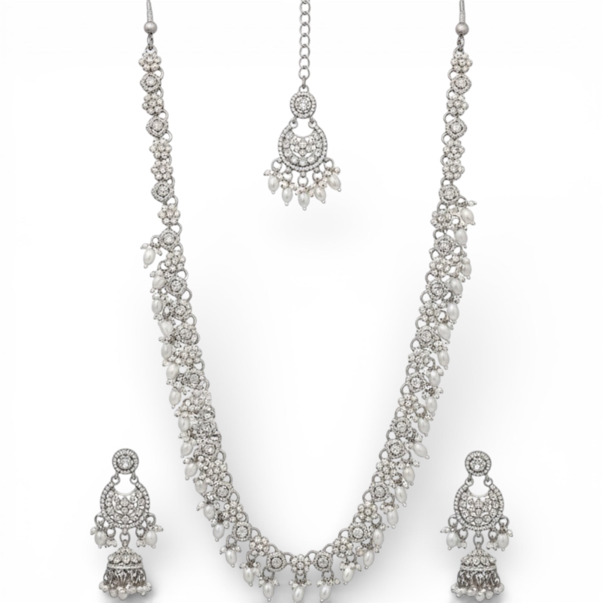 This Long Silver Indian Necklace and Tikk Earrings Set offers elegant traditional Indian wedding jewellery perfect for Asian Indian Pakistani bridal wear. Dazzle on your special day with this desi set featuring a long silver necklace and tikk earrings. Expertly crafted, this set is a must-have for any bride.
