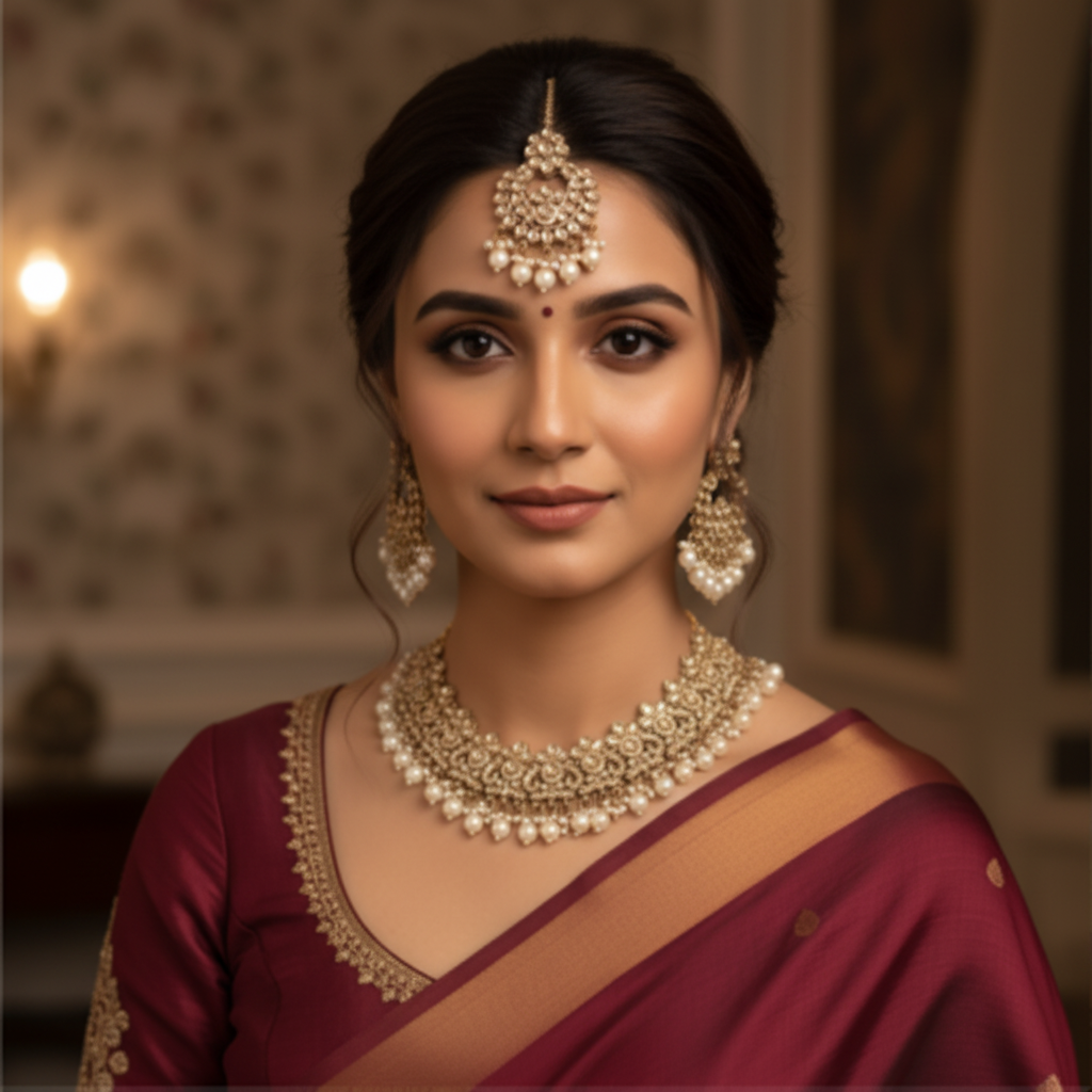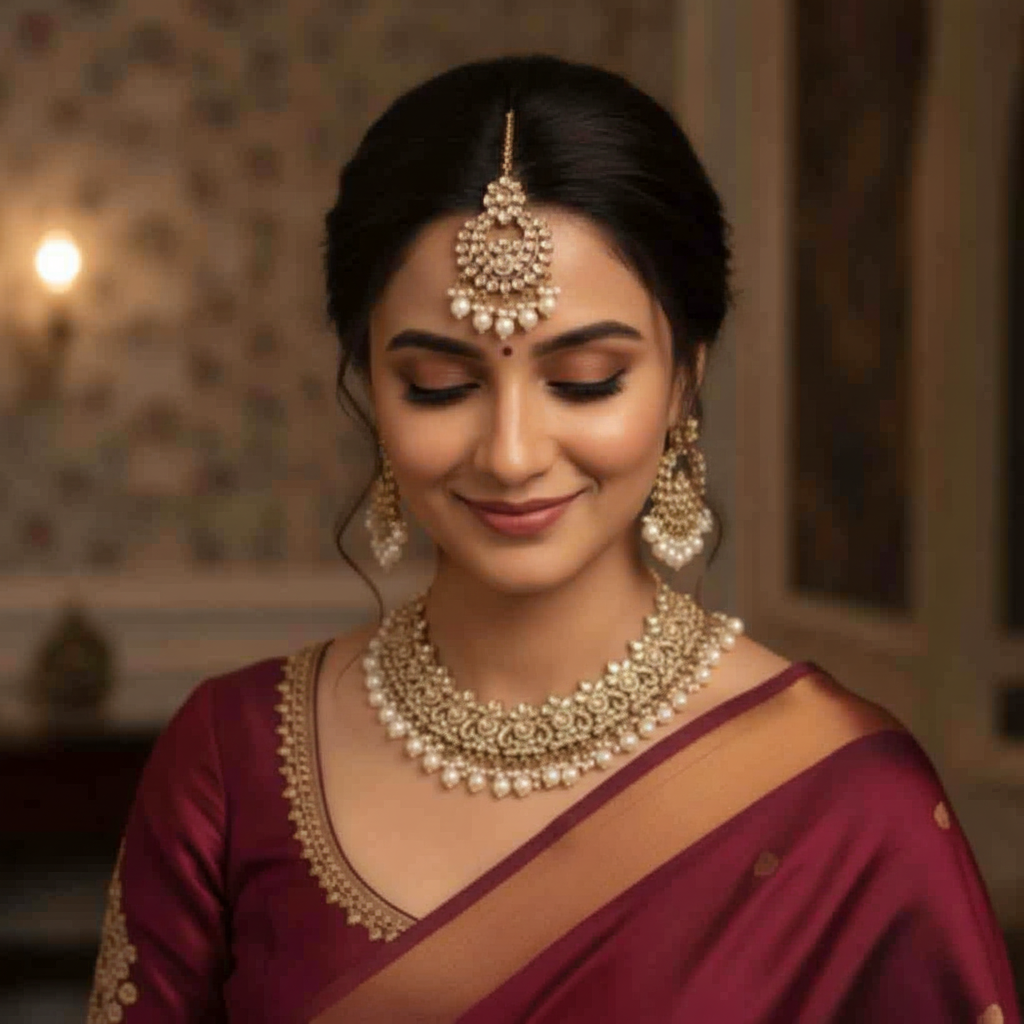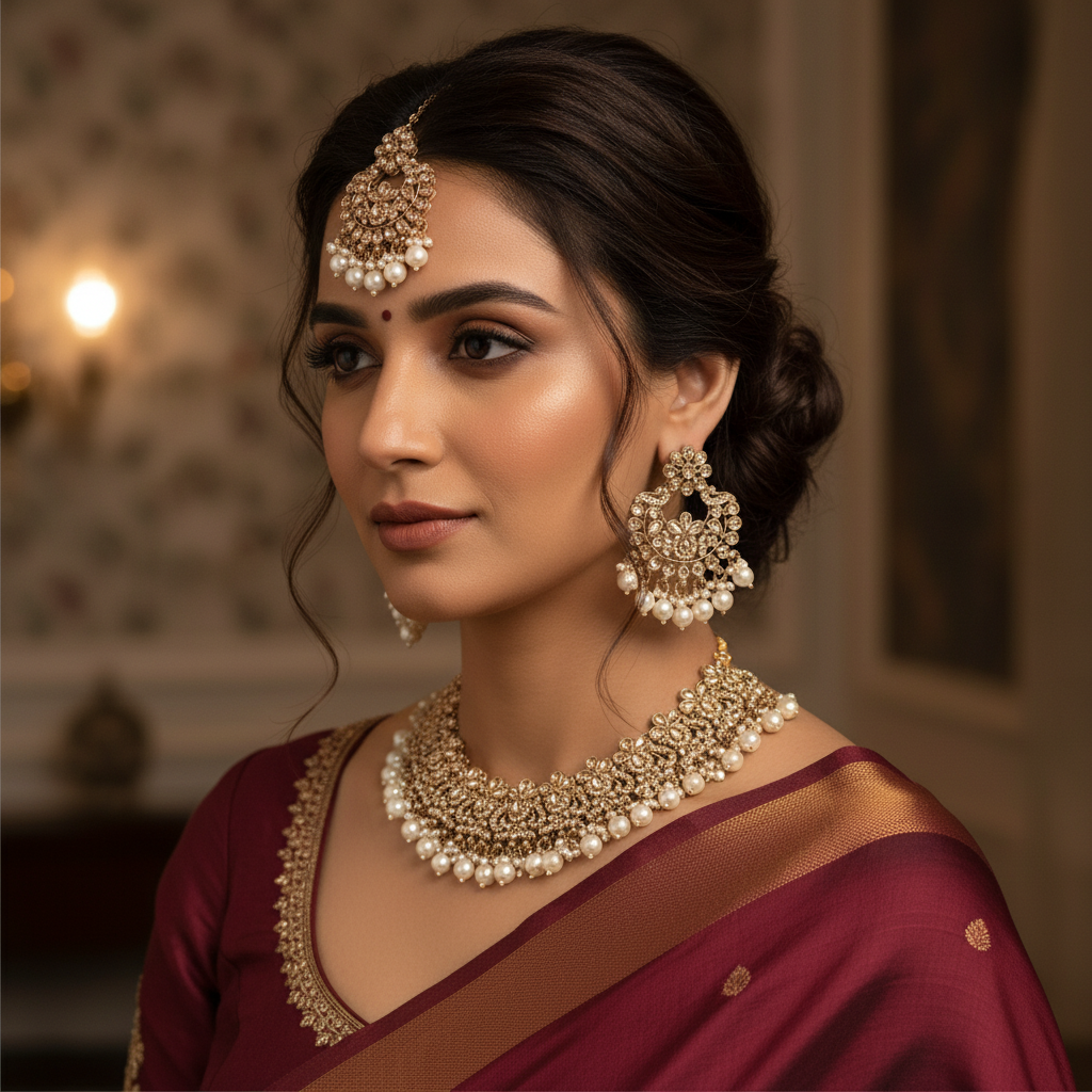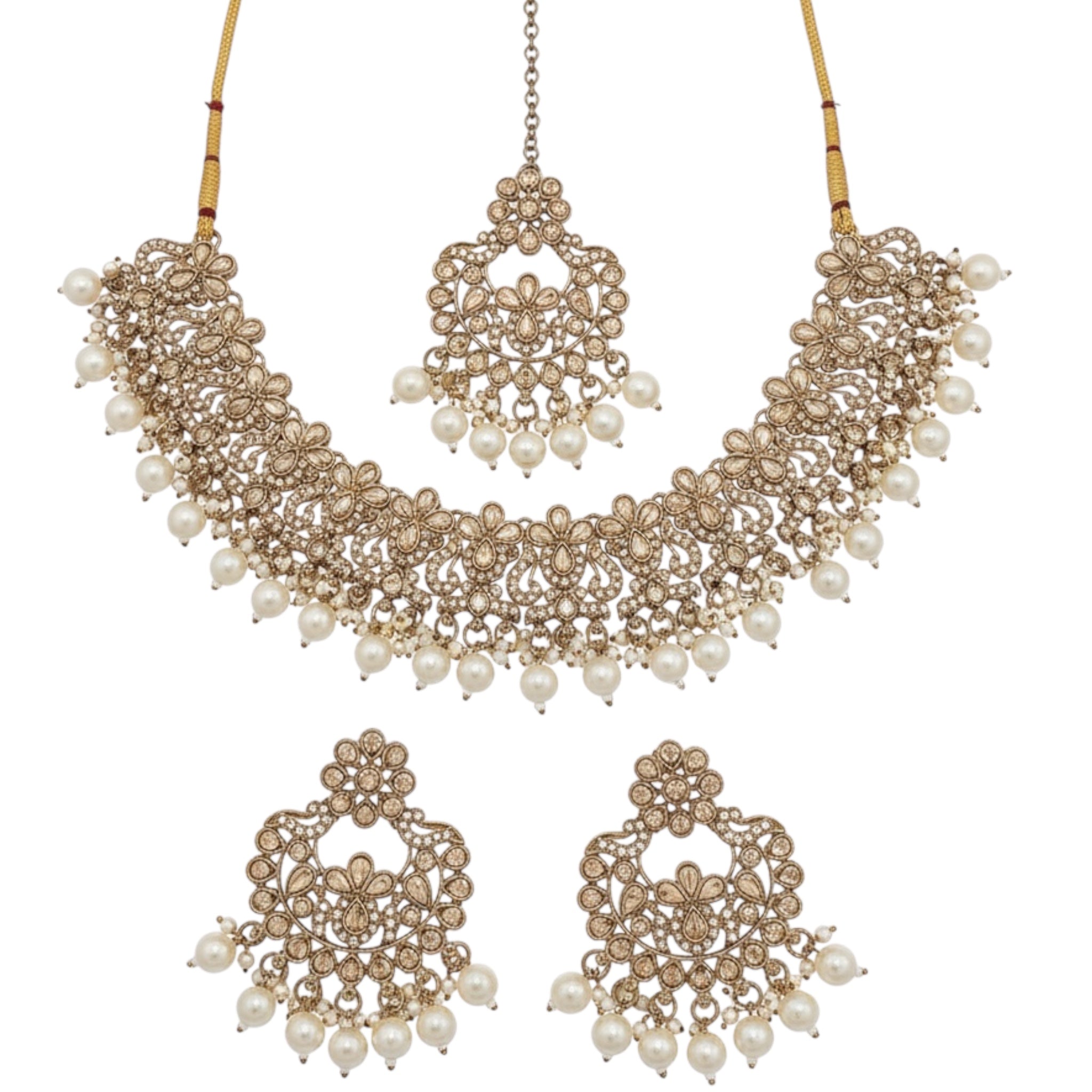 This elegant Gold Asian Kundan Necklace Set features a stunning gold-toned Kundan necklace, tikka, and earrings, perfect for any bridal occasion. Crafted with intricate detail, this set exudes a timeless and traditional charm. Elevate your bridal look with this breathtaking necklace set.