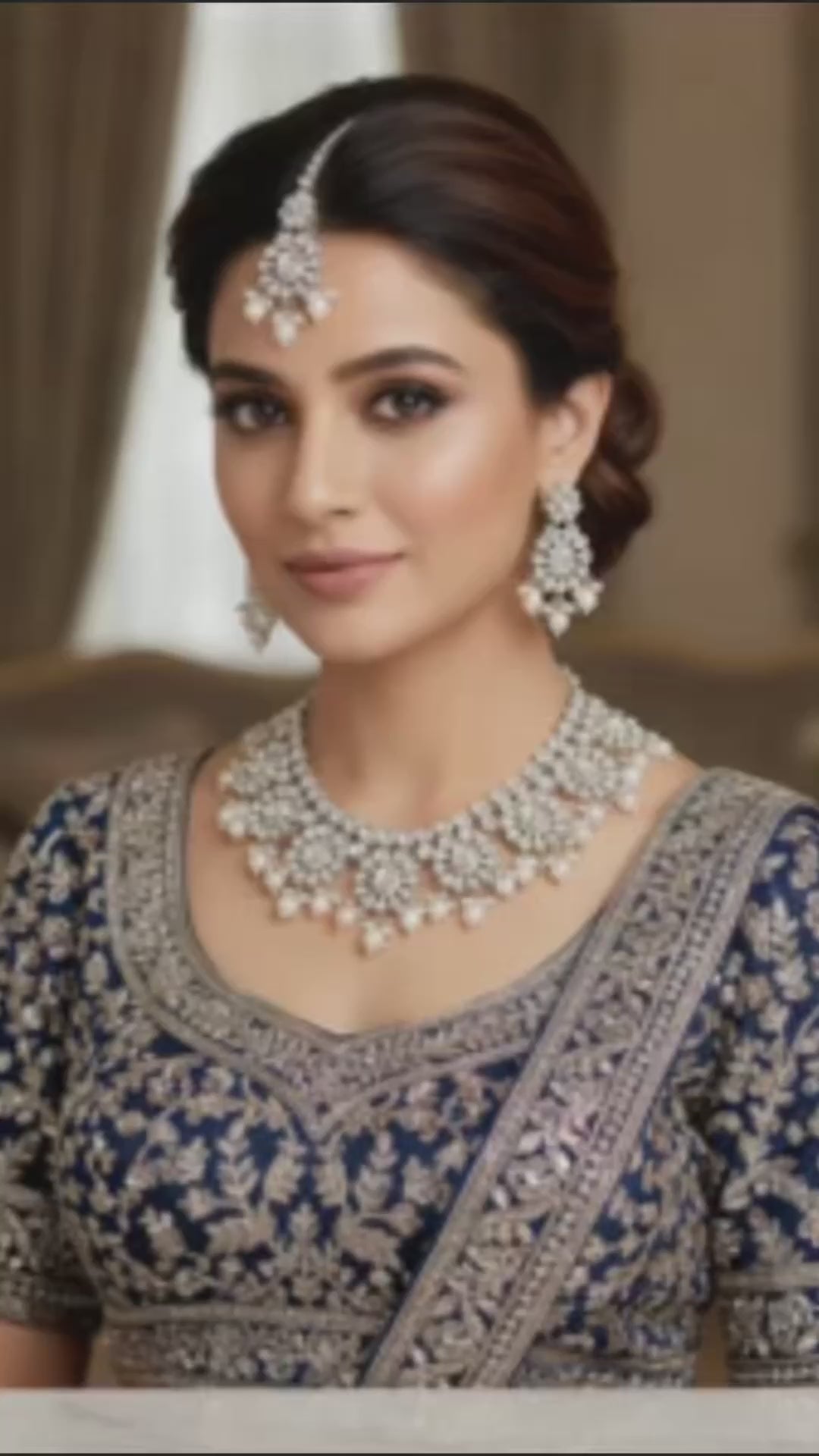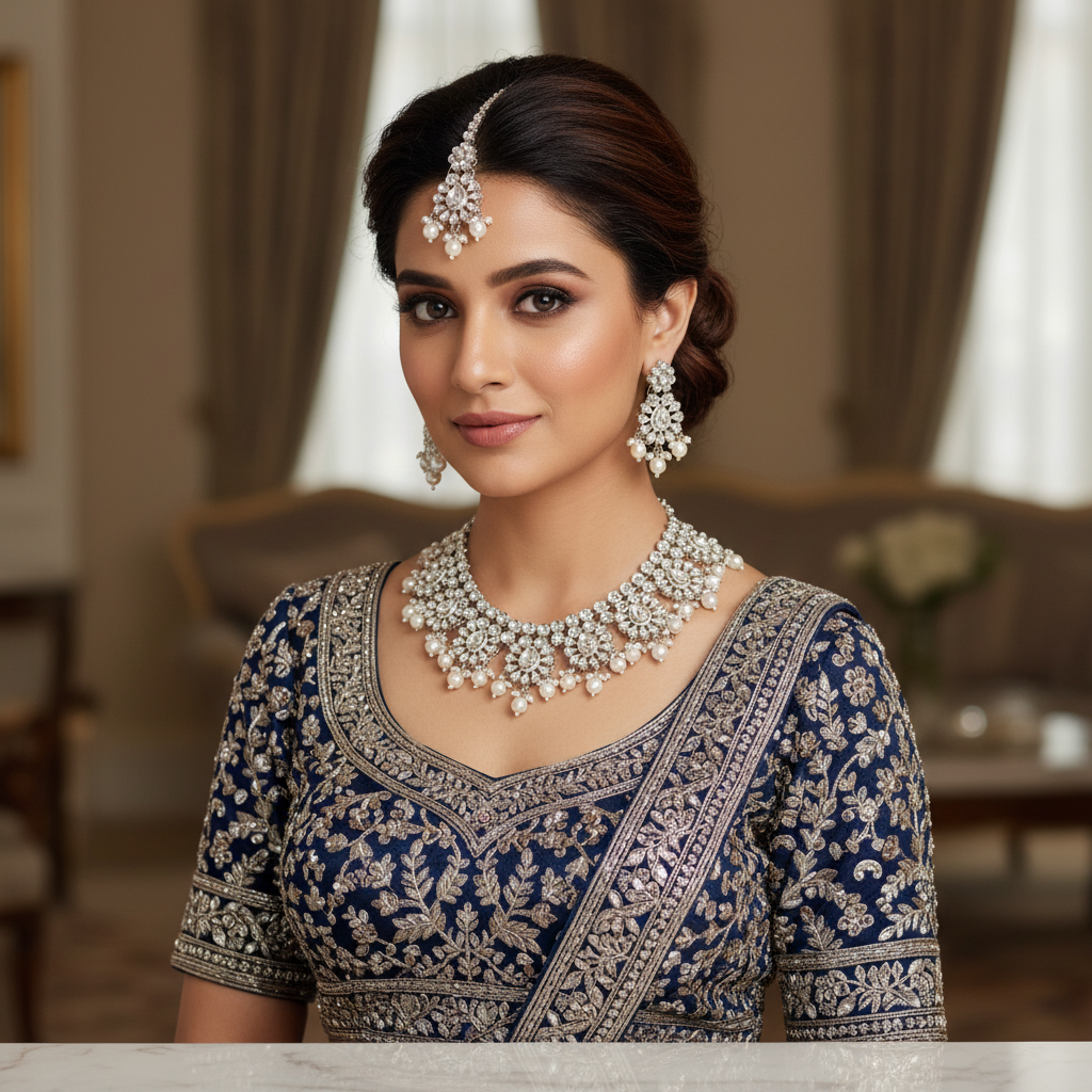 White and Silver Kundan jewellery set Includes a statement necklace, matching tikka, and earrings. Perfect for bridal, wedding, or festive wear. Elegant, traditional, and timeless design.