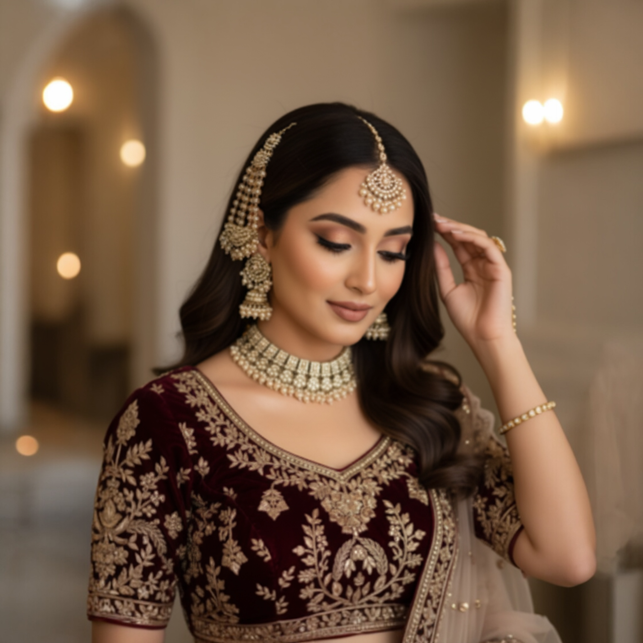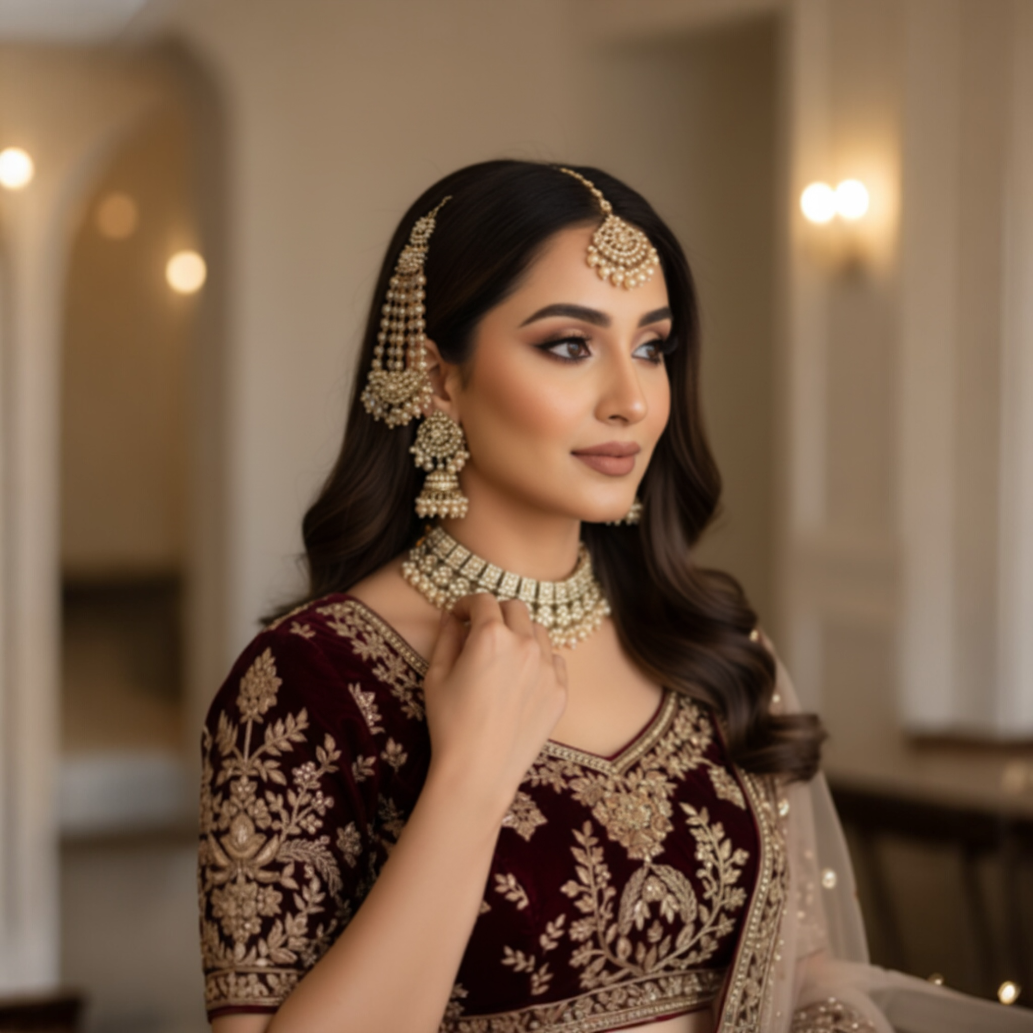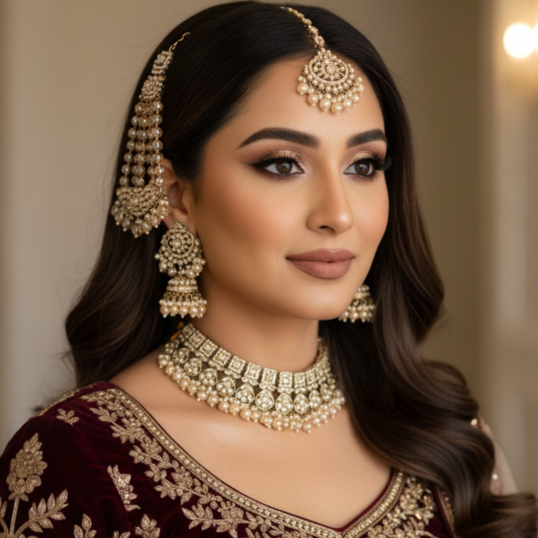 Traditional Indian gold Kundan jewelry set featuring a necklace, maang tikka, jhumka earrings and a jhumar.