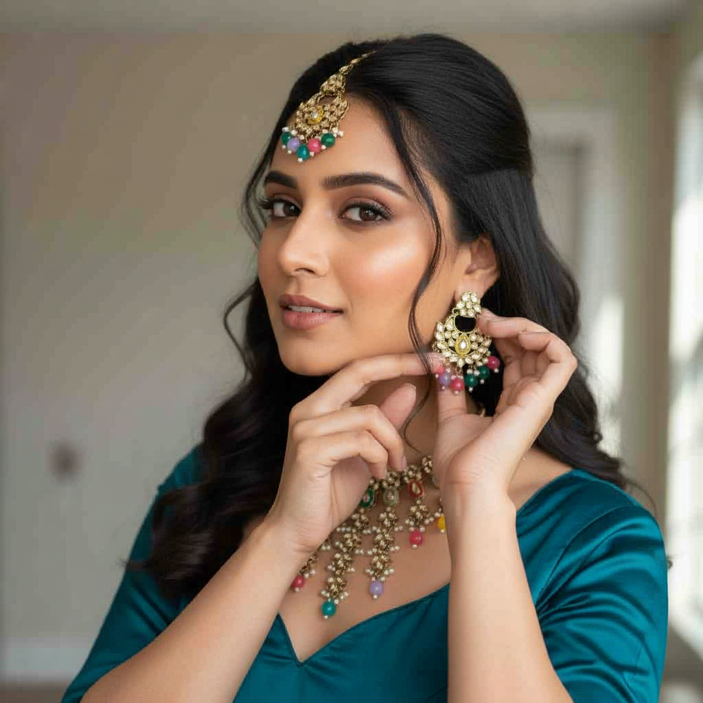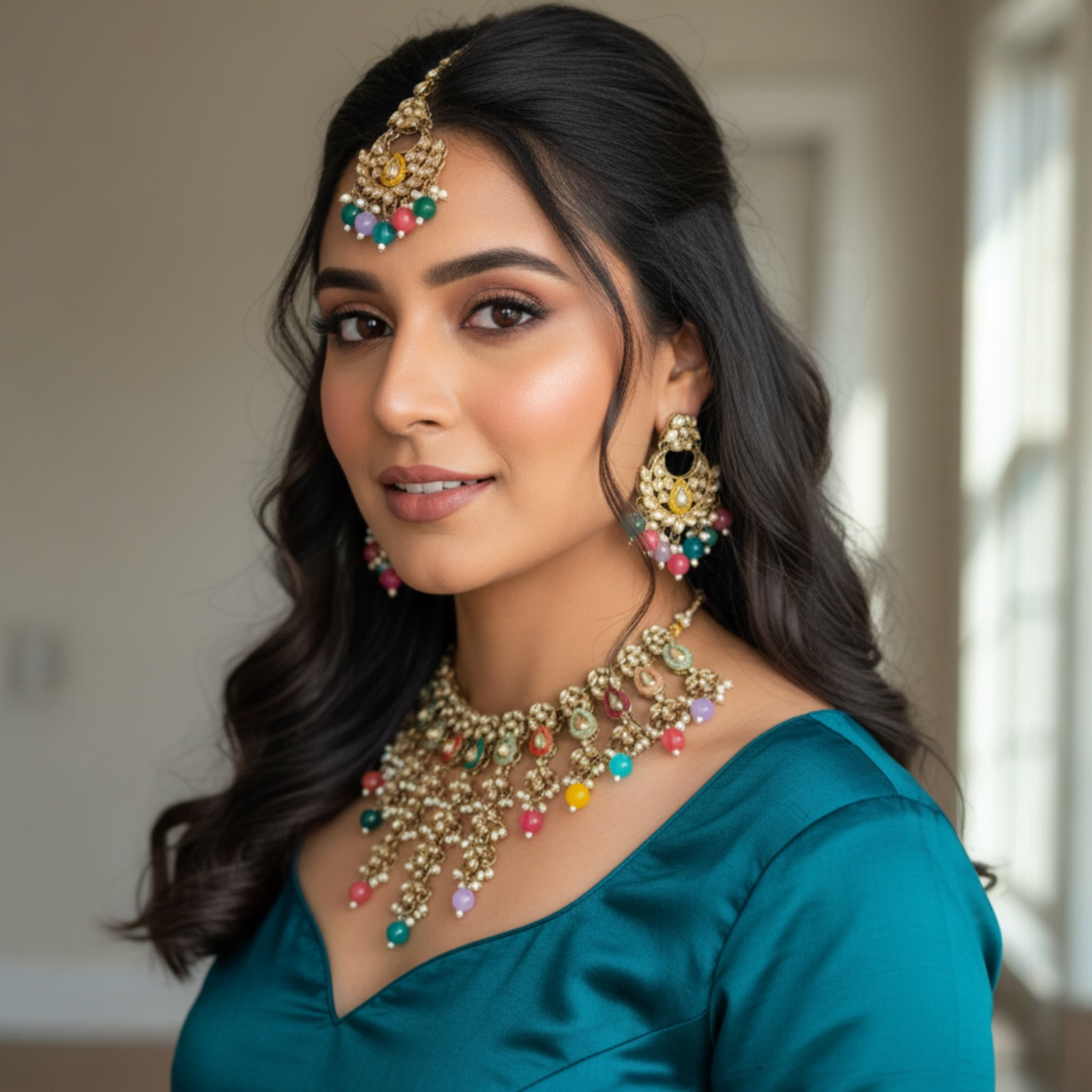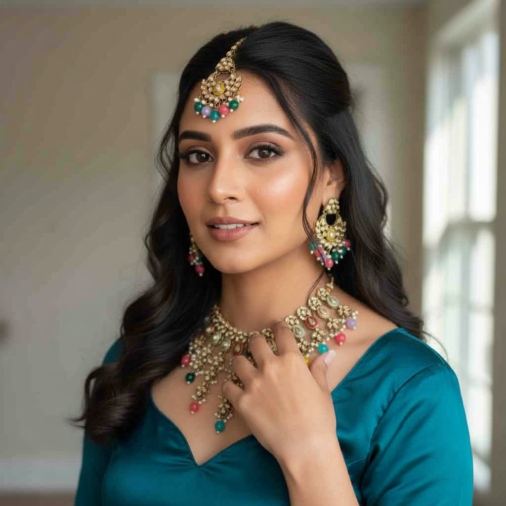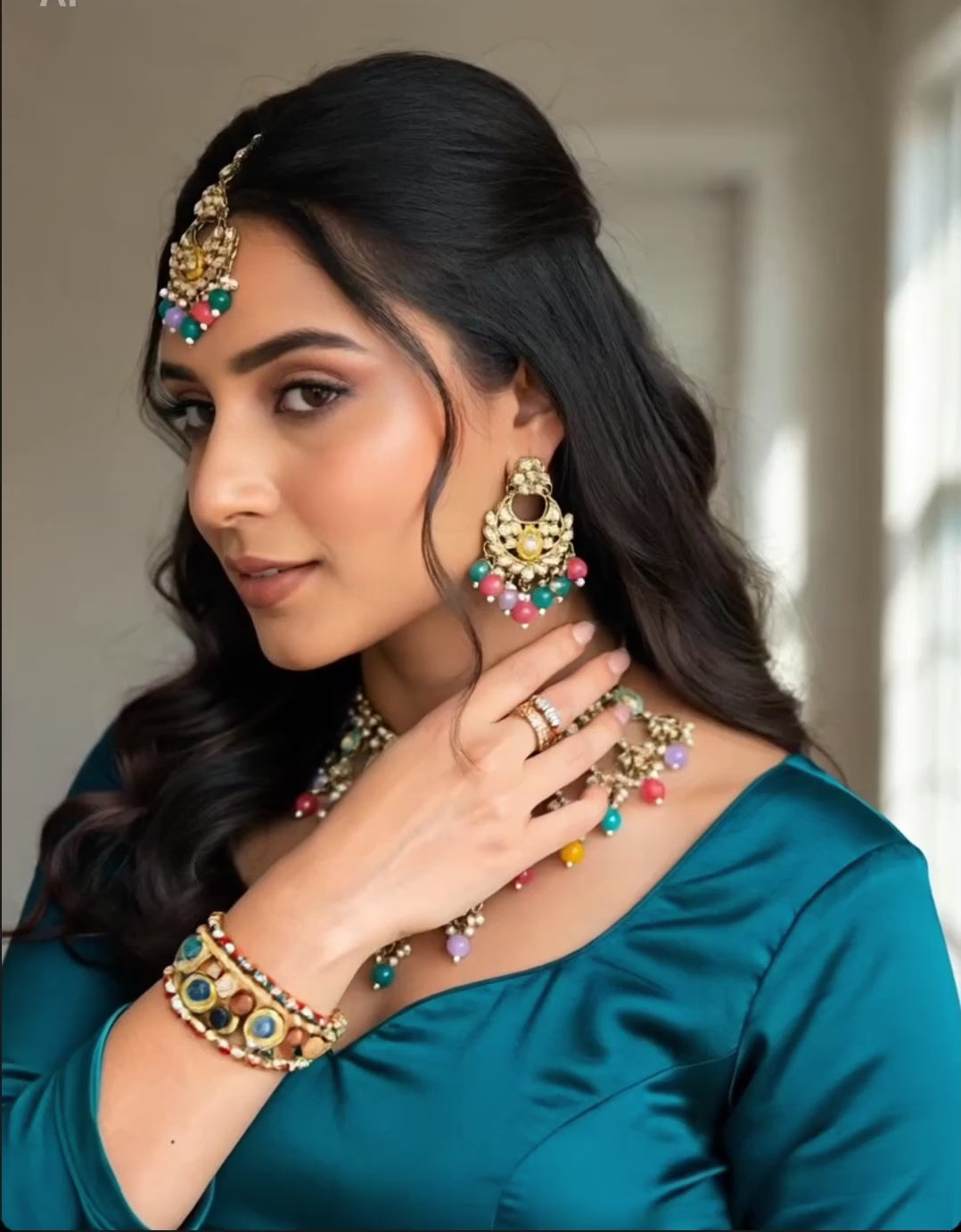 This multicoloured necklace, tikka, and earrings set features high-quality Kundan stones, perfect for Asian weddings and traditional Indian events. With its lightweight design, you can comfortably wear this beautiful Desi jewelry all day long. Add a touch of elegance and culture to your outfit with this stunning set.