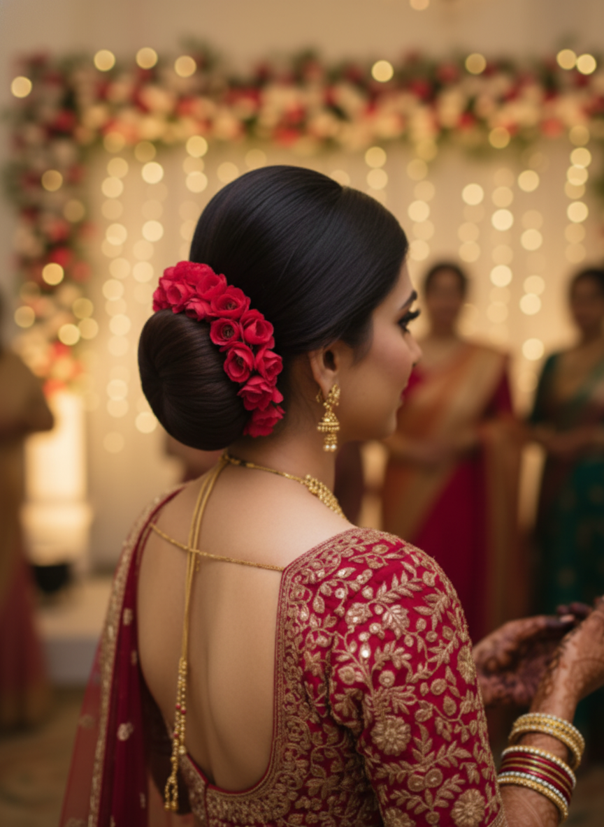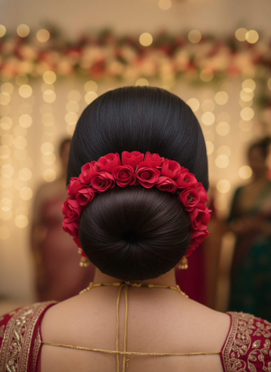 A beautiful red hair gajra in mini rose silk artificial flower, this gajra cover all around the bun giving a fuller look on your hair style. The gajra is elasticated and very flexible to put on and off. It also holds the bun in place, no need for extra pins for securing. It can be reused several times.