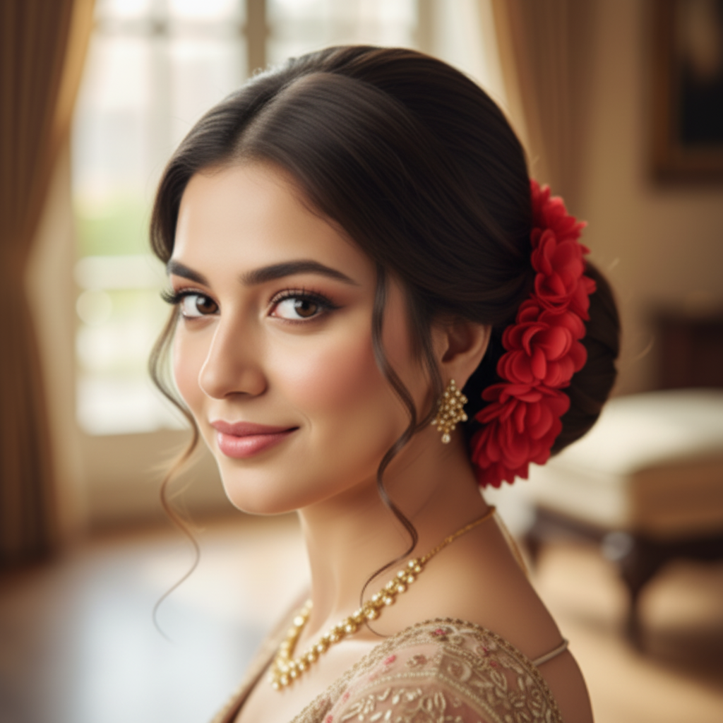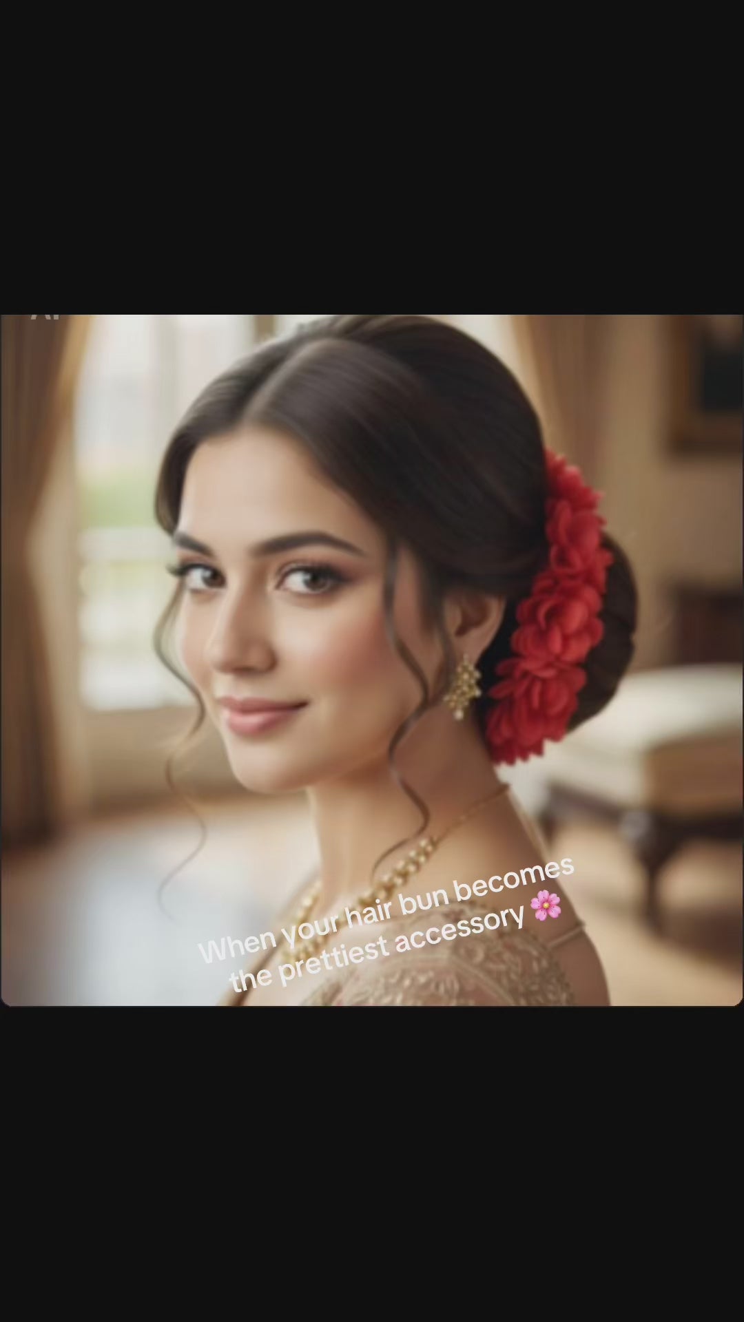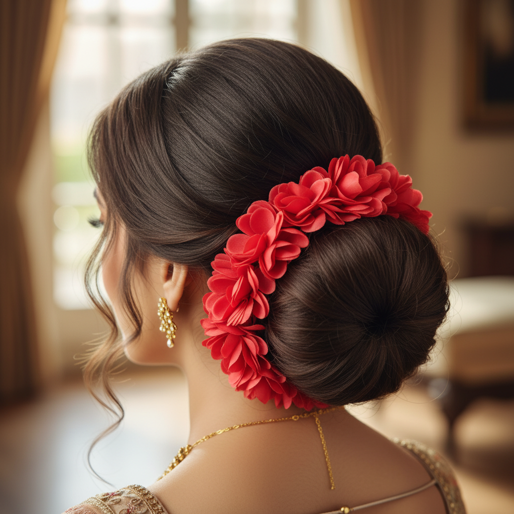 A beautiful red hair gajra in artificial flower, this gajra cover all around the bun giving a fuller look on your hair style. The gajra is elasticated and very flexible to put on and off. It also holds the bun in place, no need for extra pins for securing. It can be reused several times.