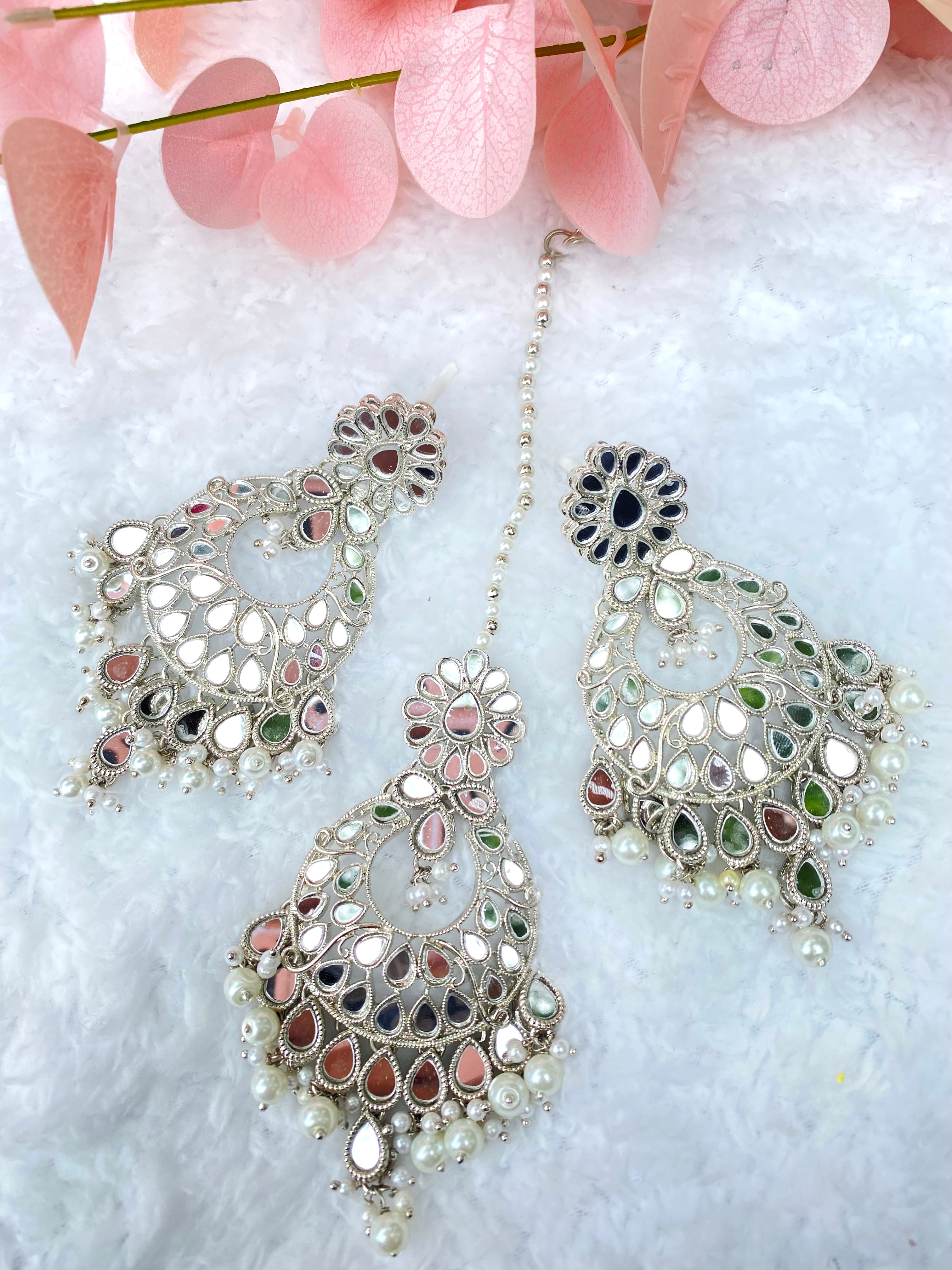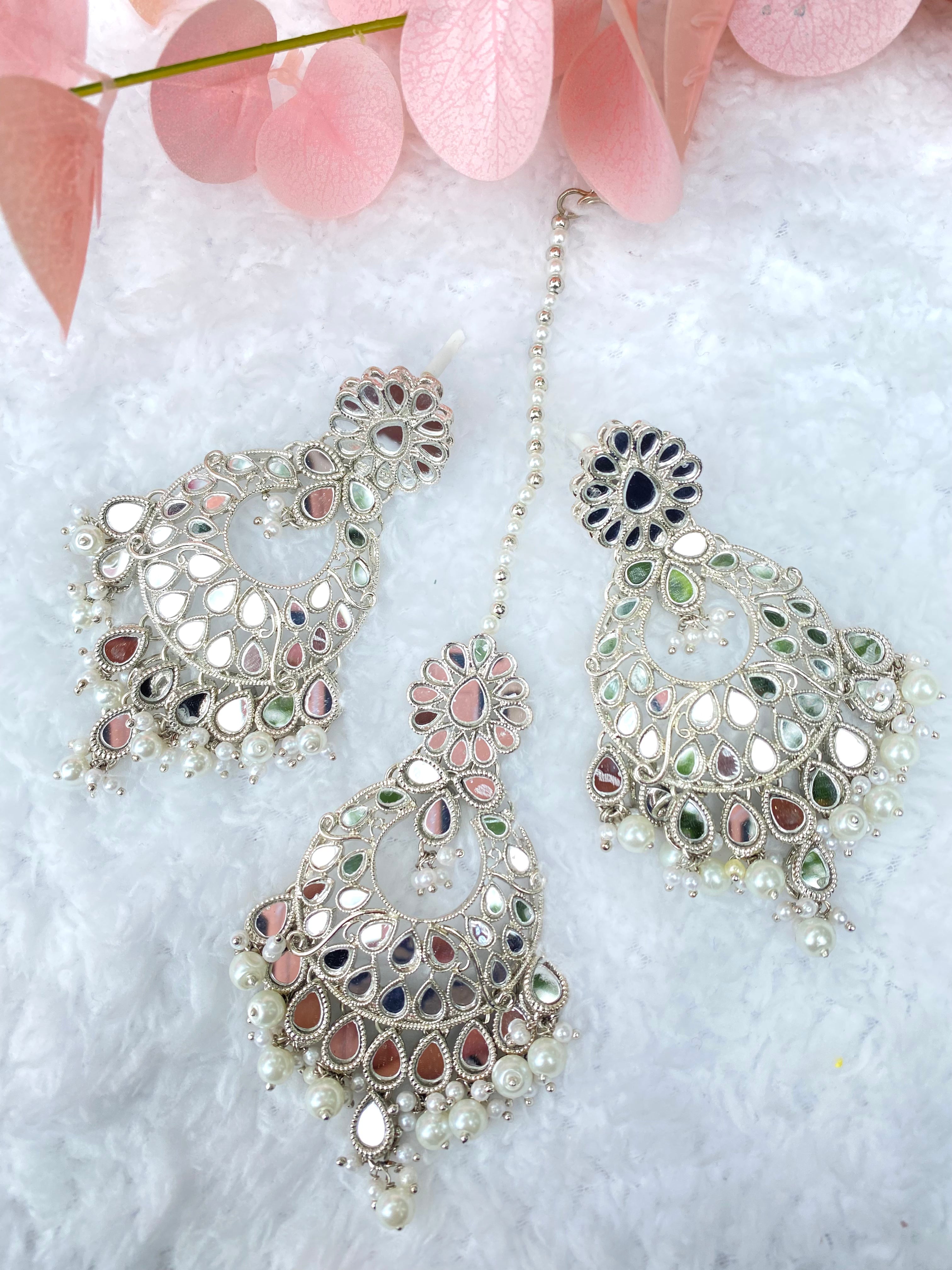 Beautiful pair of silver pearl Indian Asian earrings set with matching tikka