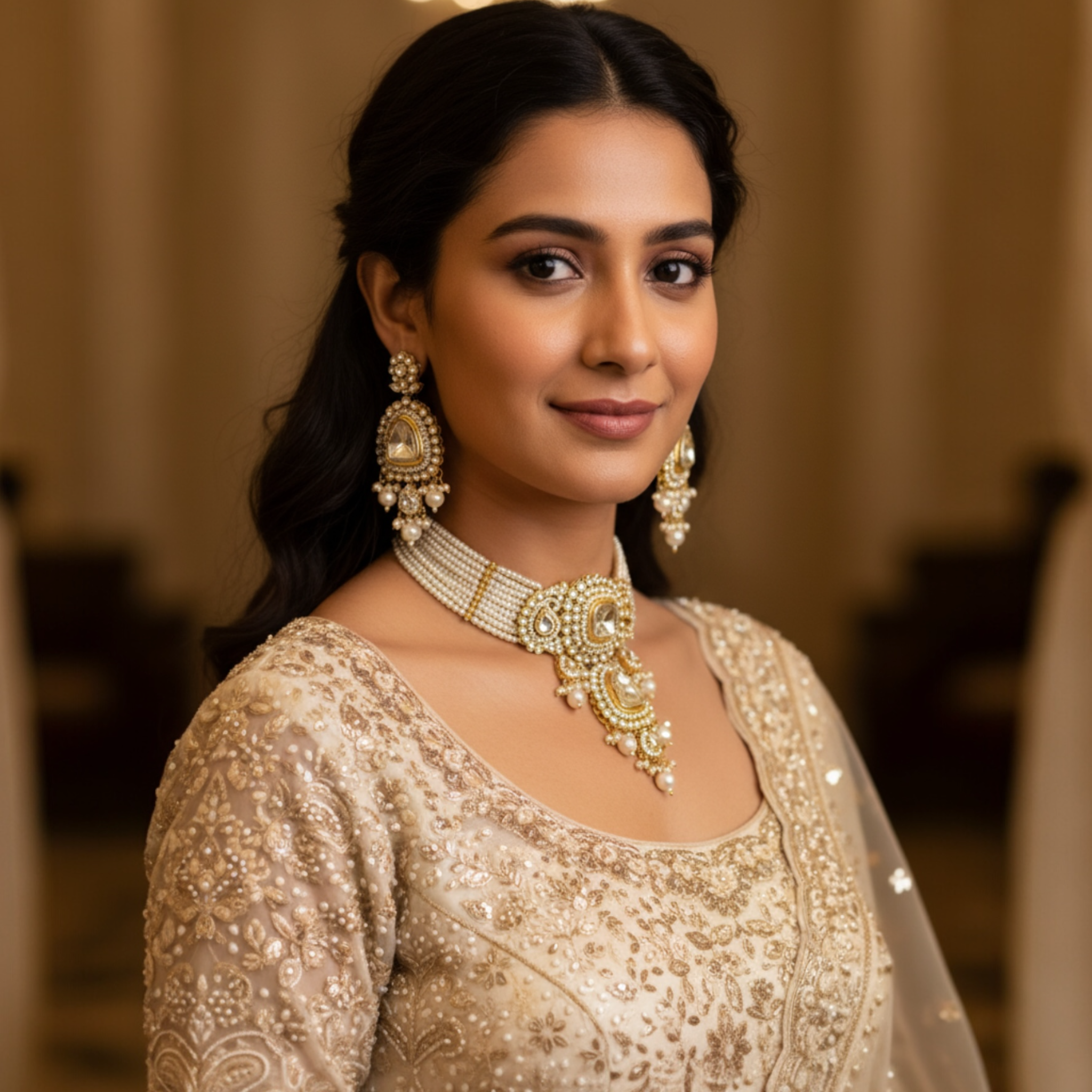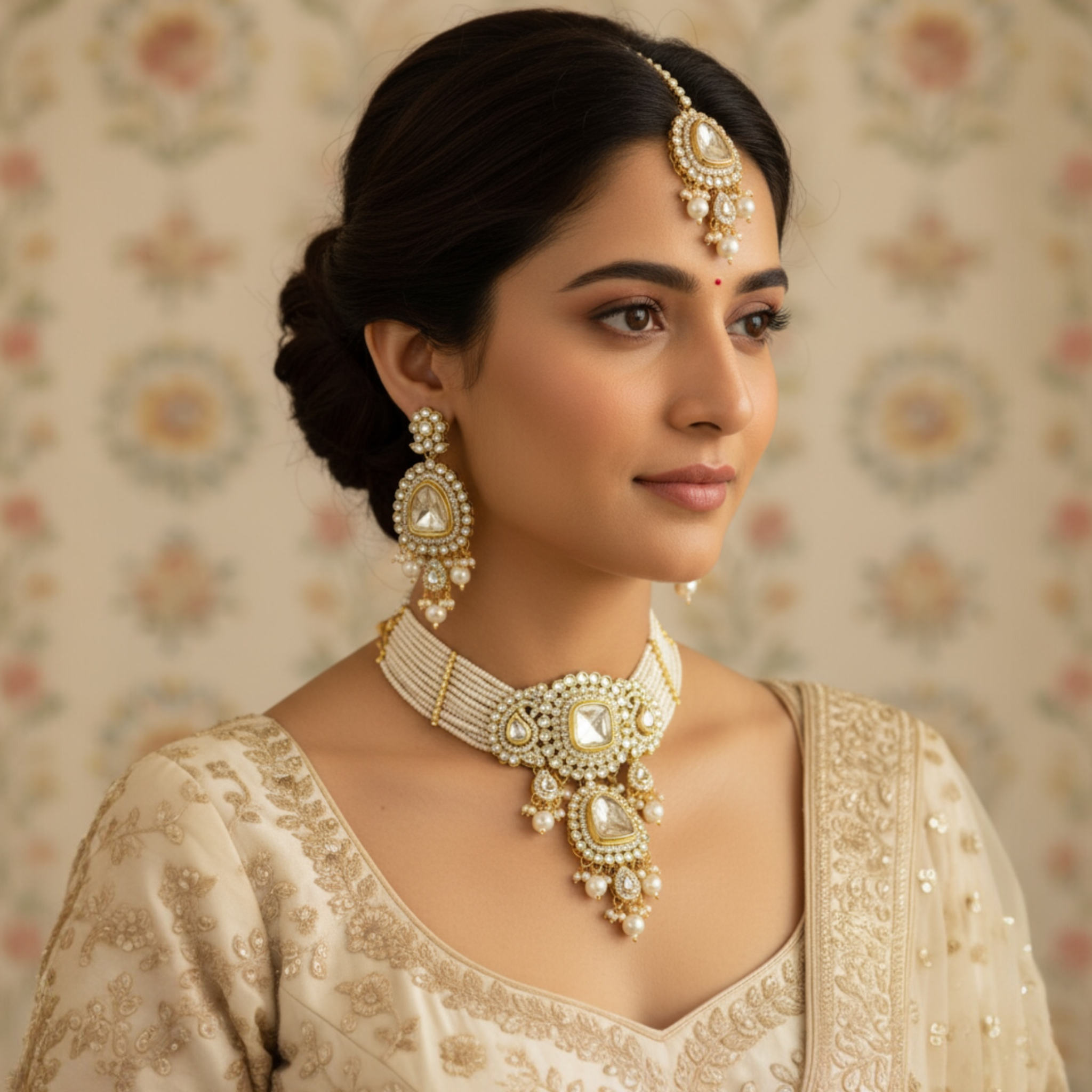 Enhance your traditional Indian bridal look with our Maleha Gold Kundan Necklace Tikka Earrings Set. Made with lightweight materials, it is easy to wear without compromising on elegance and style. Perfect for weddings and special occasions, this set exudes timeless beauty and sophistication.
