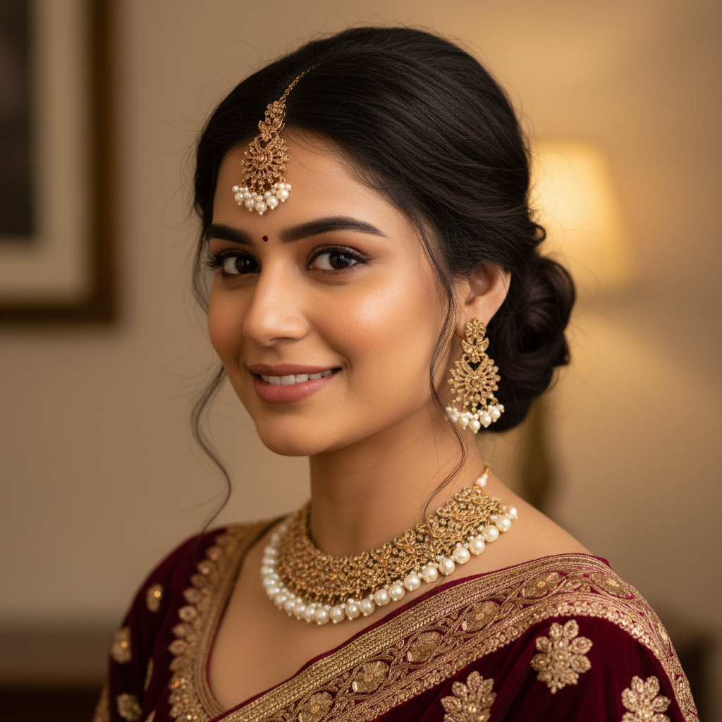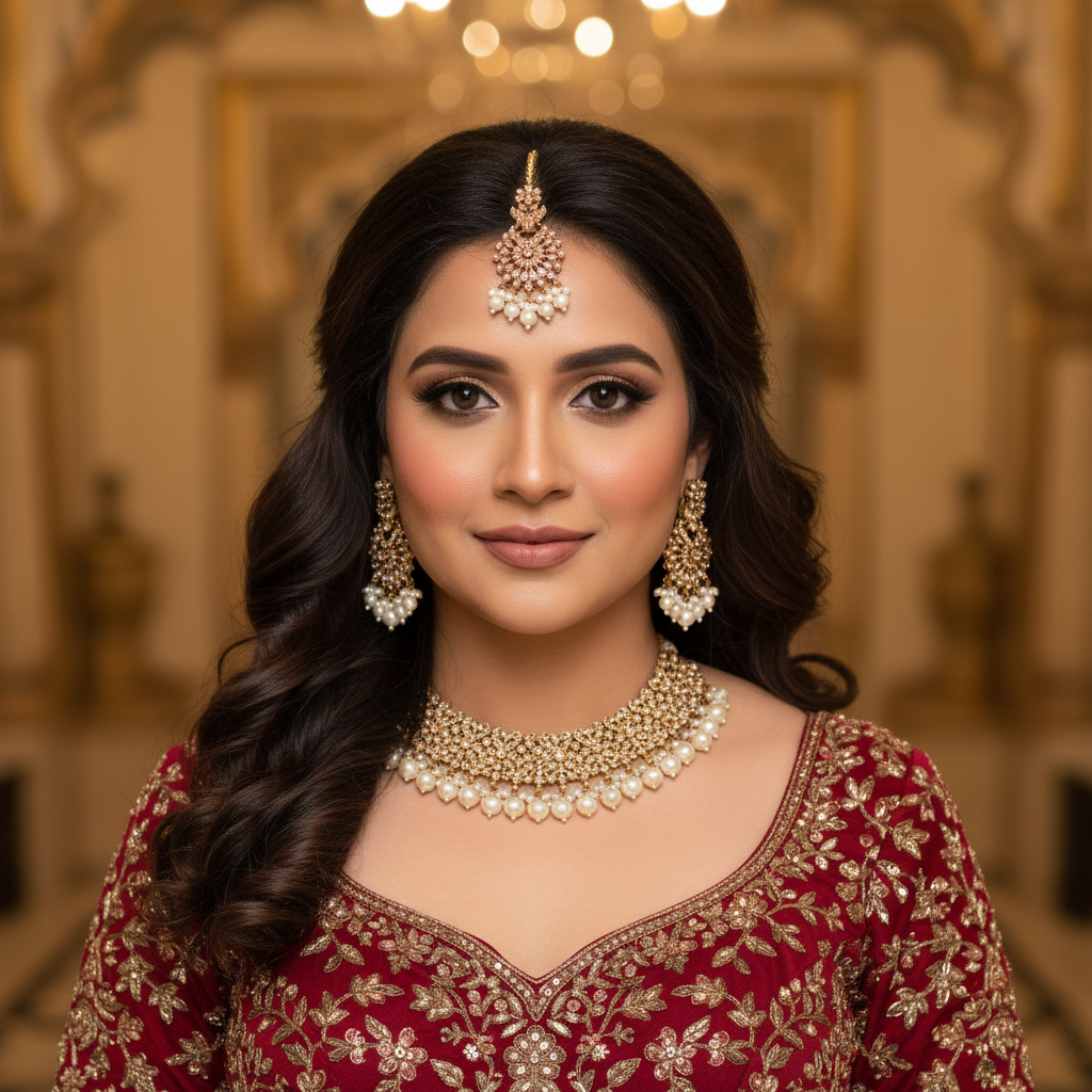 Traditional Gold Kundan Jewelry Set – Luxurious Indian bridal set featuring a handcrafted gold-tone necklace, matching tikka, and earrings. Perfect for weddings, engagements, and festive occasions. Classic ethnic design with rich detailing.