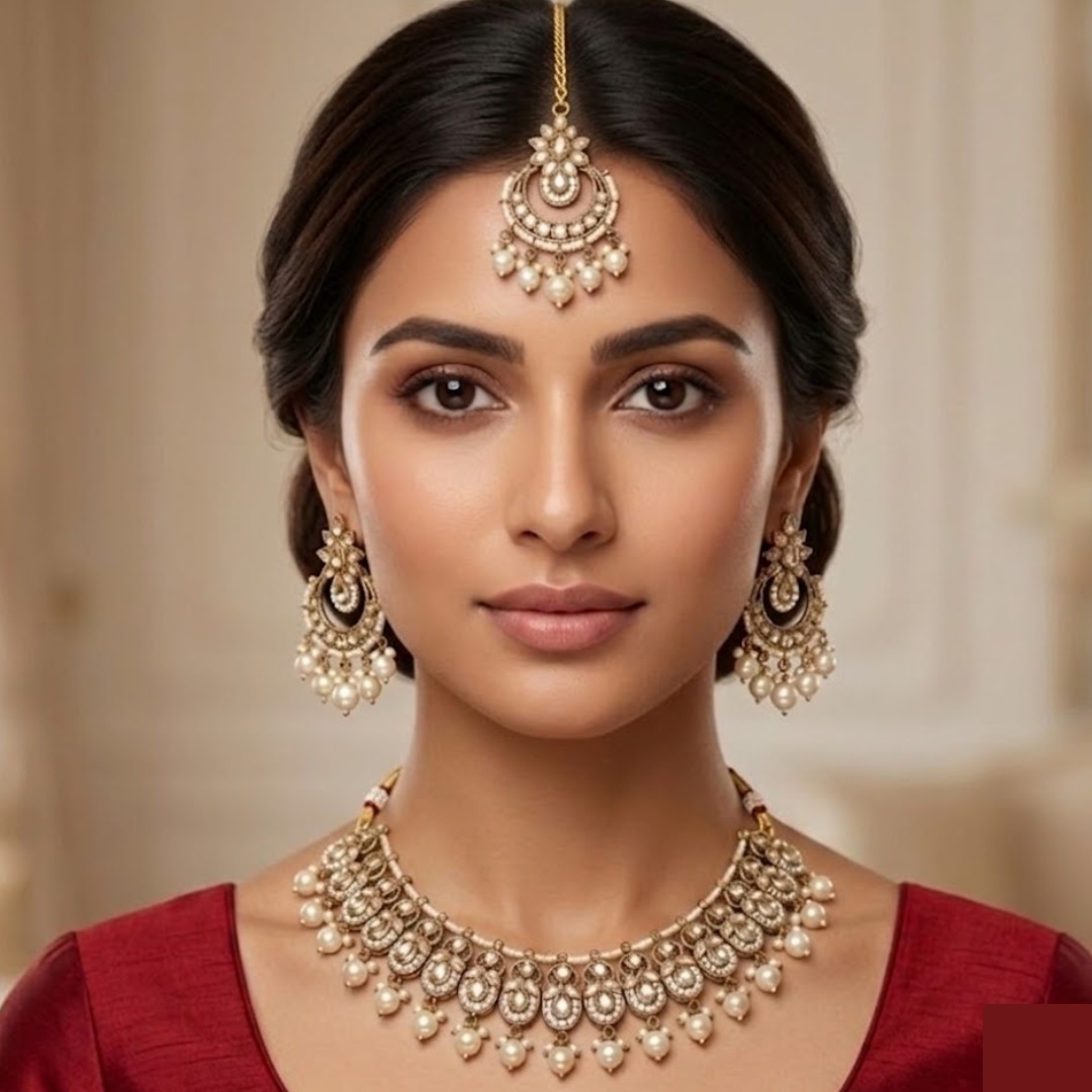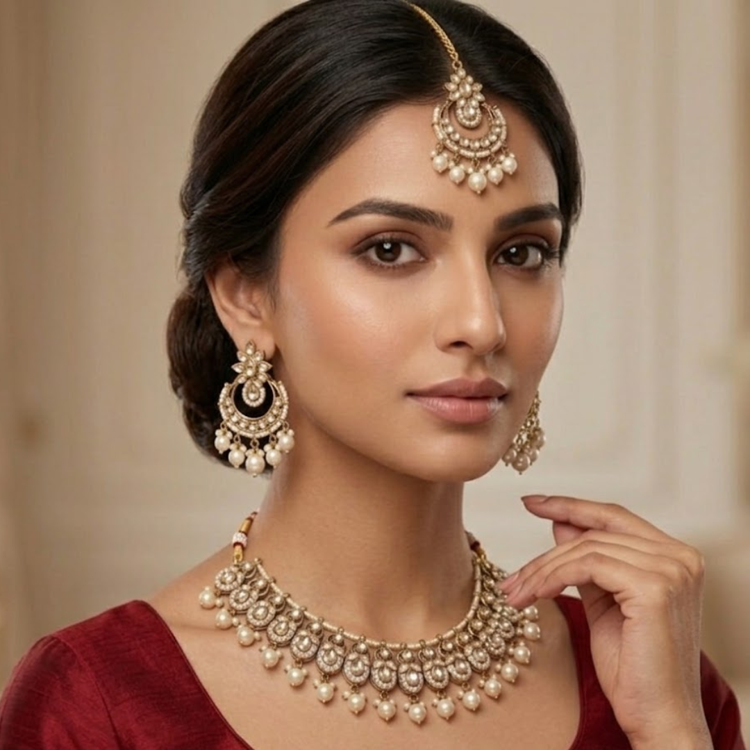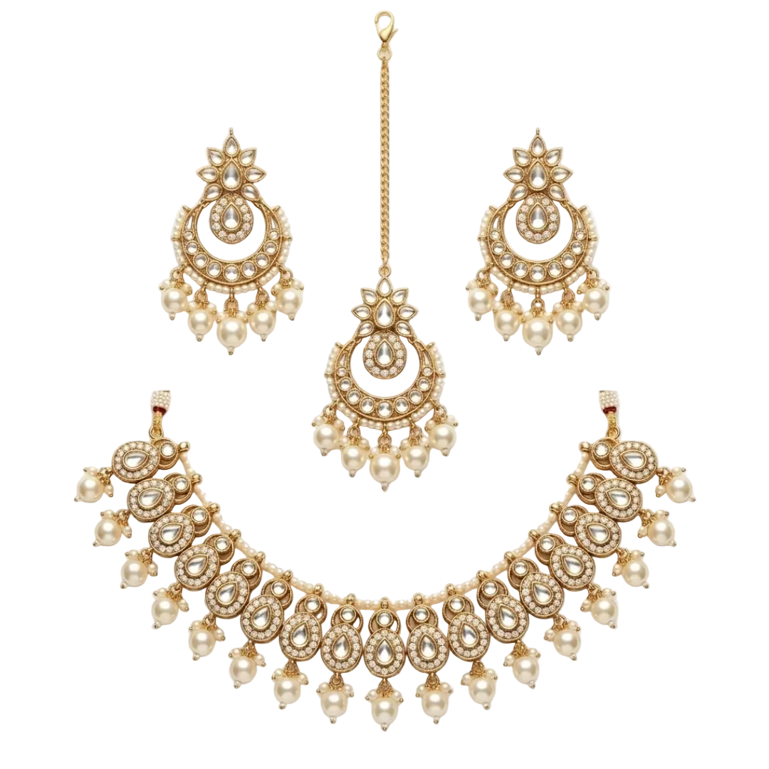 Set Includes: 1 Choker Necklace, 1 pair of matching Drop Earrings, and 1 elegant Maang Tikka.
