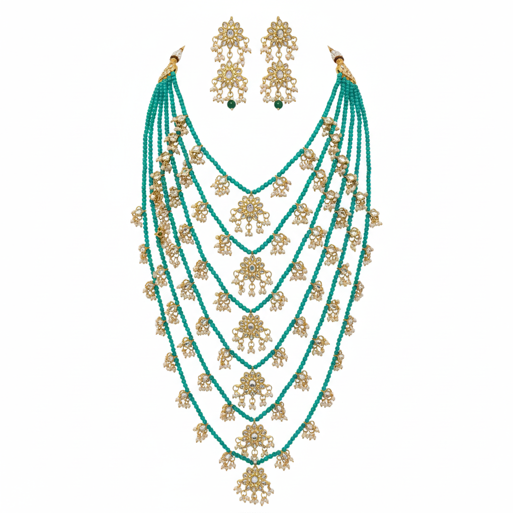 This stunning green Asian Indian jewelry set embodies elegance and cultural richness. Highlighted by a beautifully layered necklace, this piece is intricately designed with delicate gold detailing and adorned with radiant beads. The vibrant pink hue adds a touch of charm and sophistication, making it an ideal choice for weddings, festive celebrations, and special occasions. The intricate craftsmanship and harmonious blend of beaded layers with gold accents create a timeless piece that enhances traditional attire with grace and luxury.