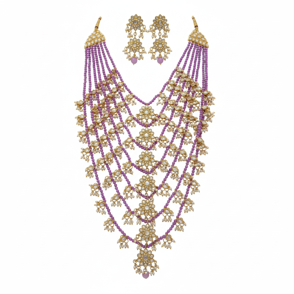 This exquisite purple Asian Indian jewelry set radiates elegance and cultural allure. Featuring a beautifully layered necklace, the piece is designed with intricate gold detailing and adorned with rich, luminous beads. The vibrant purple color adds a touch of regal sophistication, making it perfect for weddings, festive celebrations, or special occasions. The meticulous craftsmanship and blend of beaded layers with gold accents create a timeless accessory that enhances traditional attire with grace and opulence.