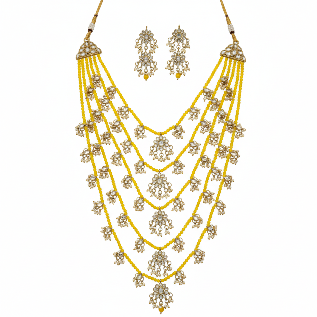 This stunning yellow Asian Indian jewelry set exudes elegance and cultural richness. The set includes a beautifully layered necklace, crafted with intricate gold detailing and adorned with delicate, shimmering beads. The soft yellow hue adds a graceful touch, making it an ideal choice for weddings, celebrations, or any special occasion. With its exceptional craftsmanship and the perfect fusion of beaded layers and gold accents, this necklace is a timeless piece that complements traditional attire with sophistication and luxury.