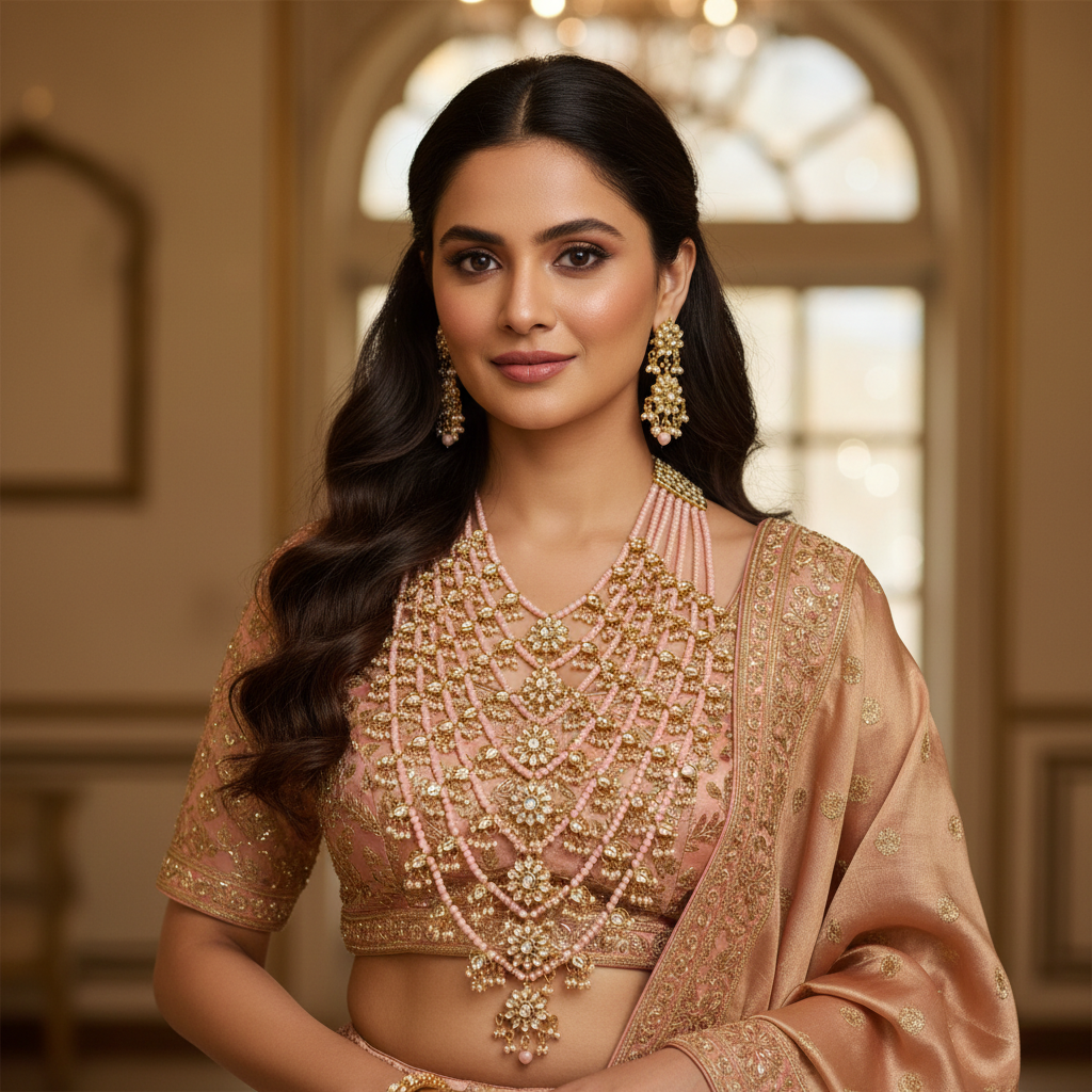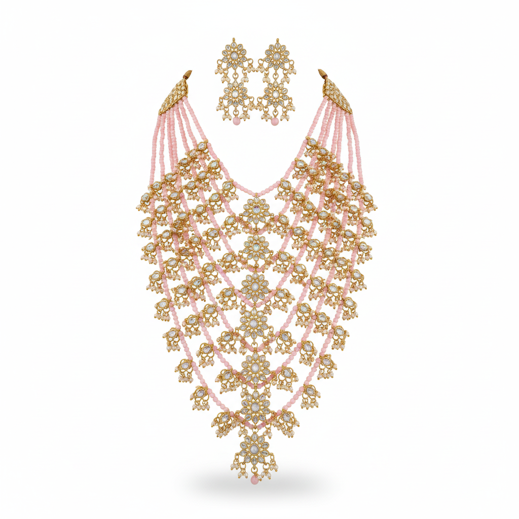 This exquisite pink Asian Indian jewelry set embodies elegance and cultural richness. Highlighted by a beautifully layered necklace, the set showcases intricate gold detailing and is adorned with radiant beads. The soft pink hue lends a touch of feminine sophistication, ideal for weddings, traditional celebrations, and special occasions. The meticulous craftsmanship and harmonious combination of layered beads and gold accents create a timeless piece that enhances traditional Indian attire with grace and luxurious charm.