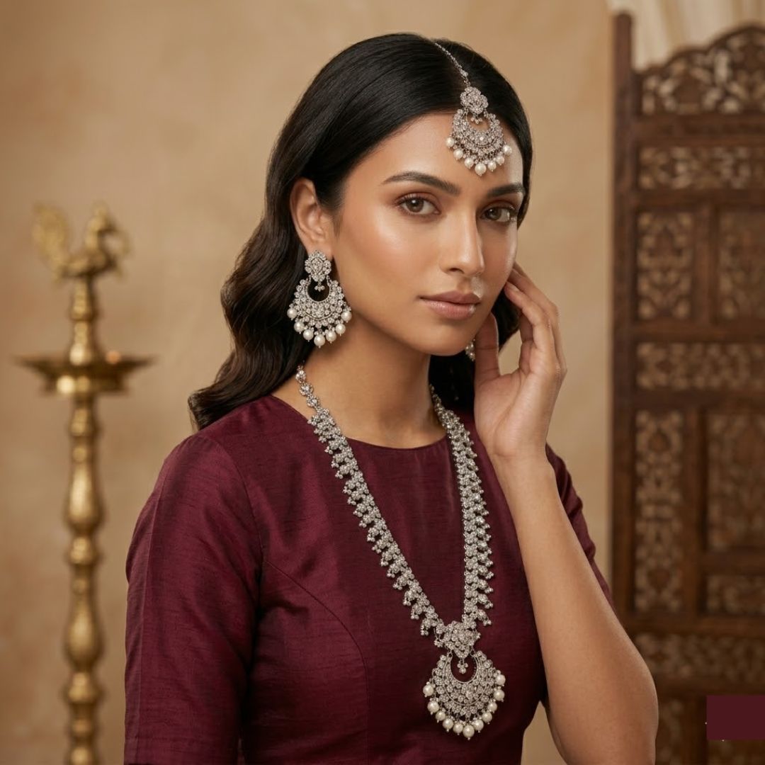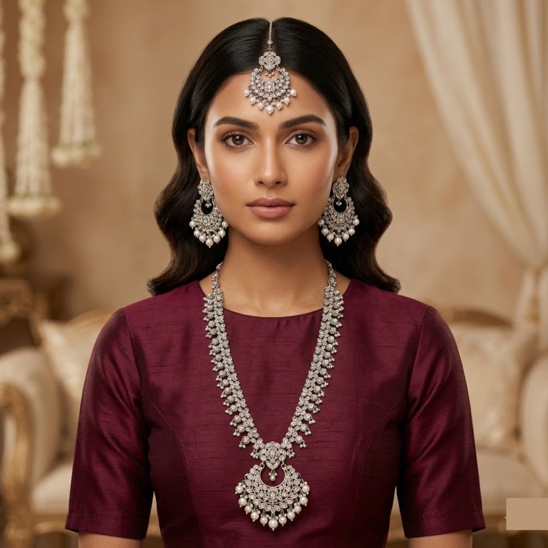Exude timeless grace with our Antique Silver Raani Haar set. This masterpiece features the iconic Chandbali crescent design, intricately layered with shimmering stones and soft white pearl drops. It is a statement piece designed to bring a royal touch to your special day.