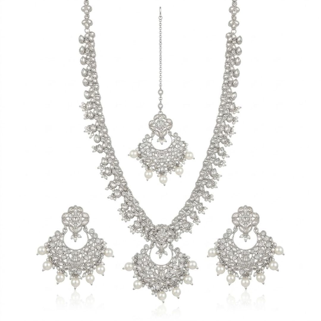 Riya Silver Chandbali Raani Haar Set - Long Bridal Necklace with Statement Earrings & Maang Tikka - Traditional Pakistani Indian Wedding Jewelry