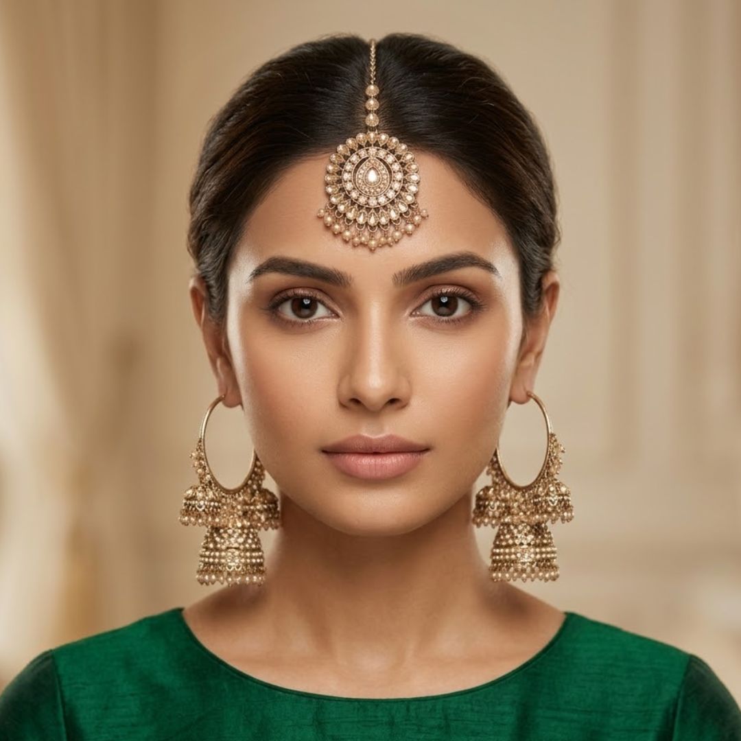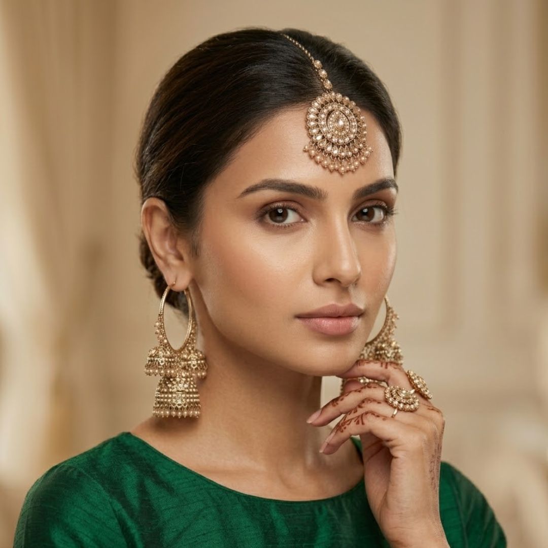 • Set Includes: 1 Pair of Jhumka Earrings, 1 Maang Tikka.