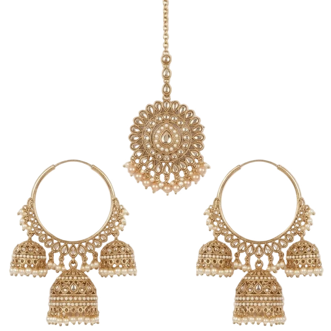 Tarana Gold Jhumka Earrings and Maang Tikka Set - Traditional Indian Bridal Jewelry - Pearl Bead Drop Hoop Earrings - South Asian Wedding Jewelry Set