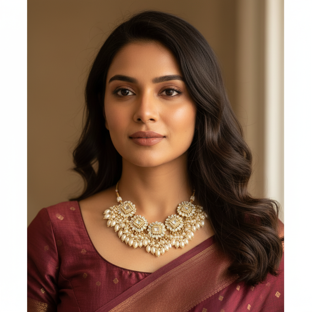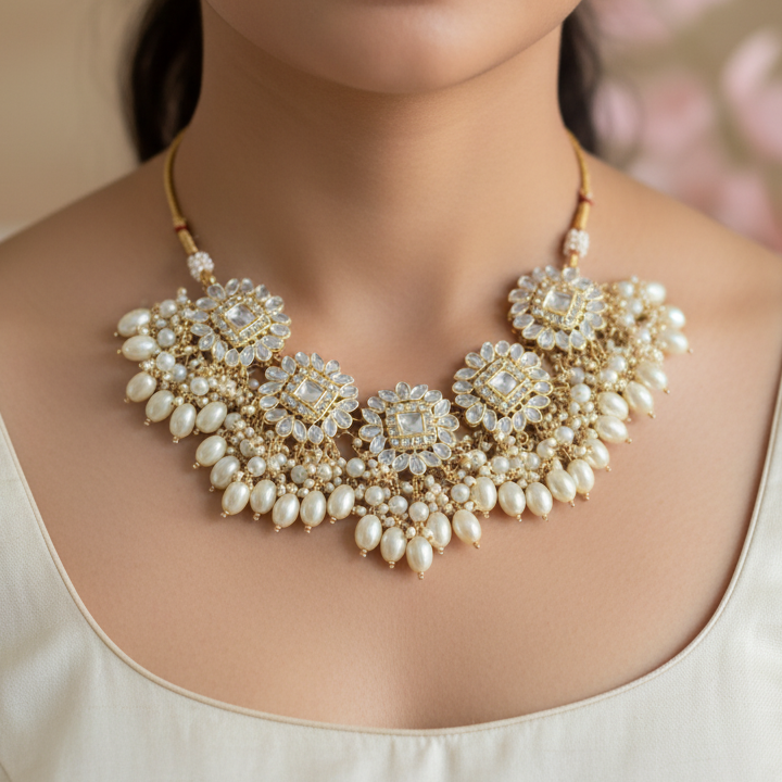 Elevate your ethnic look with this elegant Pearl Kundan Gold Necklace, crafted to add timeless charm to any traditional outfit. Featuring classic kundan work paired with lustrous pearls, this necklace is perfect for weddings, festive occasions, and special celebrations.