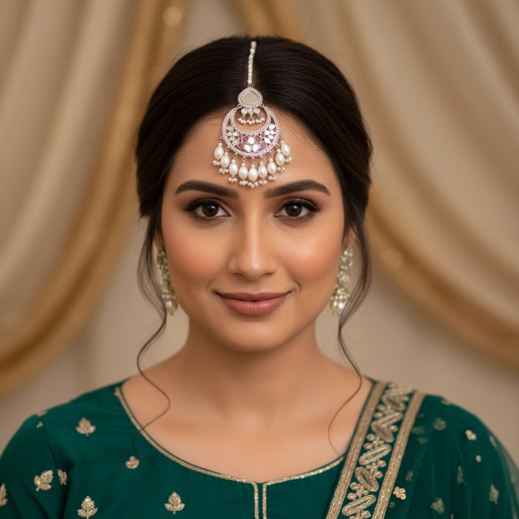 Featuring intricate mirror detailing with a rich gold finish, this tikka sits beautifully on the forehead and adds a graceful statement to any bridal outfit. Perfect for Indian, Pakistani, and Asian weddings, mehndi events, and special occasions, it pairs effortlessly with lehengas, sarees, and festive wear.