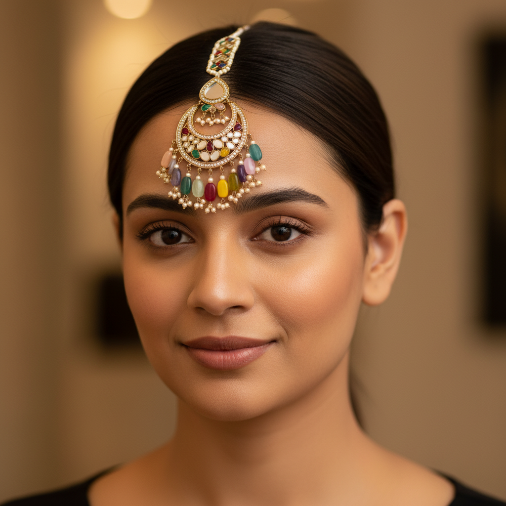 Featuring colourful mirror detailing with intricate accents, this statement tikka sits beautifully on the forehead and complements lehengas, sarees, and festive outfits. Ideal for Indian, Pakistani, and Asian weddings, mehndi events, and special occasions, it adds a bold yet elegant finishing touch.